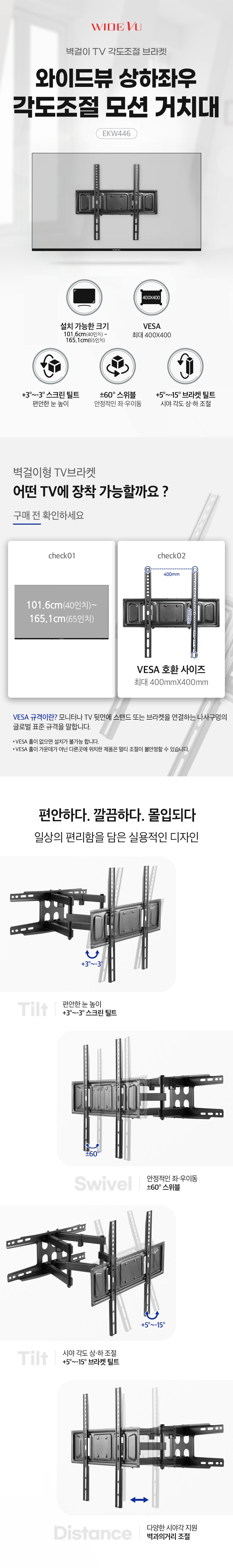 這款寬視野壁掛立式和臥式支架,型號EKW446,是您提升觀影體驗的理想選擇。它適用於40吋至65吋的電視,並支援VESA規格,安裝簡便。此支架具備螢幕傾斜和旋轉功能,讓您可以根據個人需求調整觀看角度,無論是坐著還是躺著,都能享受最佳的視覺效果。其穩定的結構設計,確保電視安全穩固,讓您使用。選擇這款壁掛支架,為您的居家娛樂空間帶來更多便利與舒適。