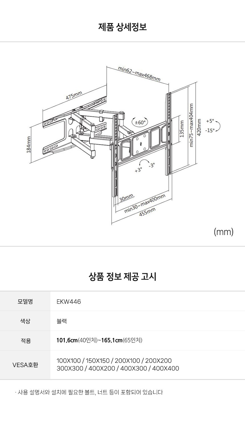 - 此支架適用於40吋至65吋電視,VESA規格最高達400x400,安裝簡便,讓您輕鬆打造個人專屬影音空間。
