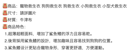 讓您的愛犬在水中也能安全又時尚!這款橘色寵物救生衣採用超輕薄的牛津布面料,不僅增加了鯊魚鰭的浮力,還能快速乾燥,讓狗狗在水中活動自如。後背獨特的鯊魚鰭設計,讓您在水上也能輕鬆找到狗狗的位置,增添更多樂趣。S 碼(胸圍 44-54 公分)的設計更貼合寵物身形,穿著舒適,方便運動。無論是泳池嬉戲還是海邊漫步,這款救生衣都能為您的愛犬提供安全保障,讓牠成為水上焦點!