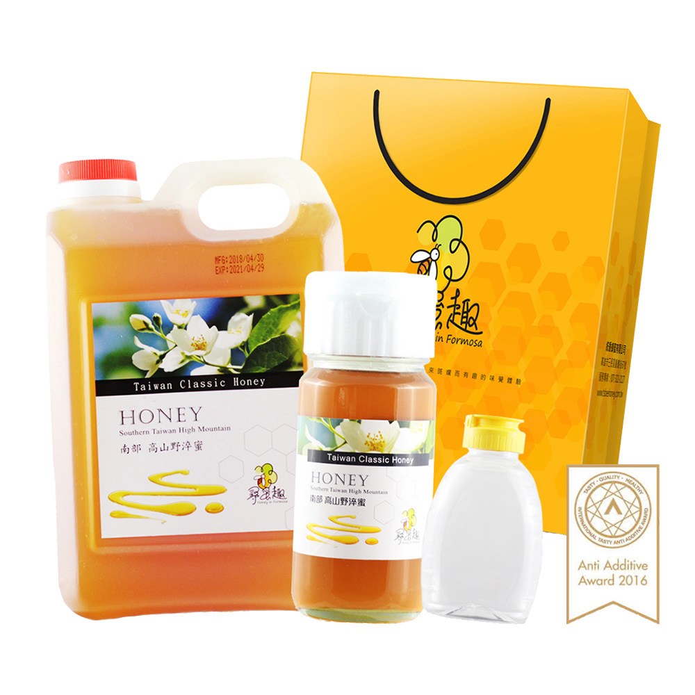 尋蜜趣得獎蜜台灣野淬蜂蜜,來自台灣南部高山,採集百花精華,尤其以大花咸豐草為主,口感獨特,帶有淡淡的百花清香。此組合包含3000g大容量裝、700g隨身瓶,以及方便攜帶的擠壓空瓶。榮獲2016年亞太AA美食獎,無添加任何人工成分。適合搭配各式甜點、飲品,為您的生活增添一份甜蜜與健康。