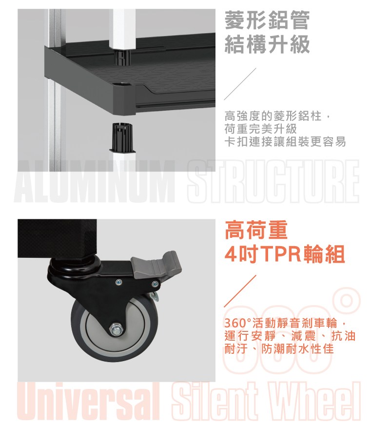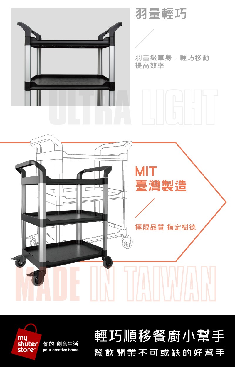 小幚廚3層手推車 T3,是您餐飲業不可或缺的好幫手。這款手推車採用鋁擠、PP及TPR把手等耐用材質製成,結構穩固,承重力強,整車可承重達200公斤,單層亦可承重70公斤,讓您安心放置各式物品。三層層架設計,提供充足的收納空間,層板內徑為653x443mm,方便您擺放餐具、食材或其他用品。此外,手推車配備4吋TPR靜音輪組,運行安靜平穩,並具有減震、抗油、耐汙、防潮等特性,讓您在各種環境下都能輕鬆移動。台灣製造,品質保證。
