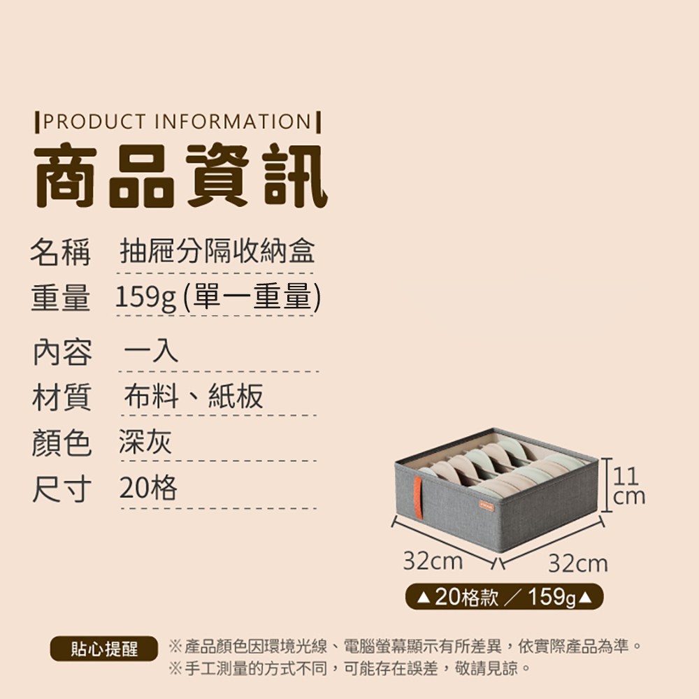 這款小麥購物內褲襪子20格分隔收納盒,是您整理抽屜空間的理想選擇。採用多格設計,輕鬆收納內衣褲、襪子等小件衣物,告別雜亂無章的窘境。內置硬隔板,確保收納盒站立穩固,不易軟塌變形。優質布料與紙板材質,堅固耐用,讓您的衣物得到妥善保護。深灰色外觀簡約時尚,輕鬆融入各種居家風格,讓收納成為一種享受。