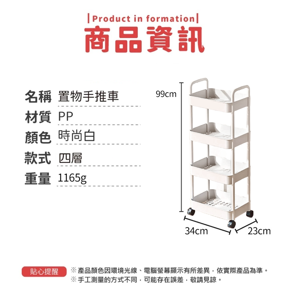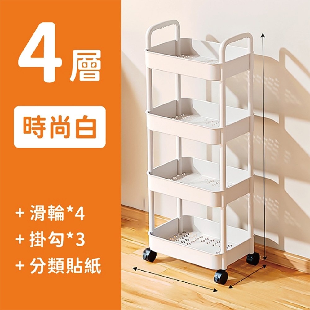 這款小麥購物四層置物小推車,以簡約的白色設計,輕鬆融入各種居家風格。採用PP材質,輕巧耐用,總重量僅1165g,移動方便。四層層架提供充足的收納空間,無論是廚房、浴室或客廳,都能有效整理物品,告別雜亂。底部滑輪設計,讓您隨時隨地輕鬆移動,打造整潔有序的生活空間。無論是收納零食、書籍、調味罐或清潔用品,這款小推車都能滿足您的需求,讓您的生活更加便利舒適。