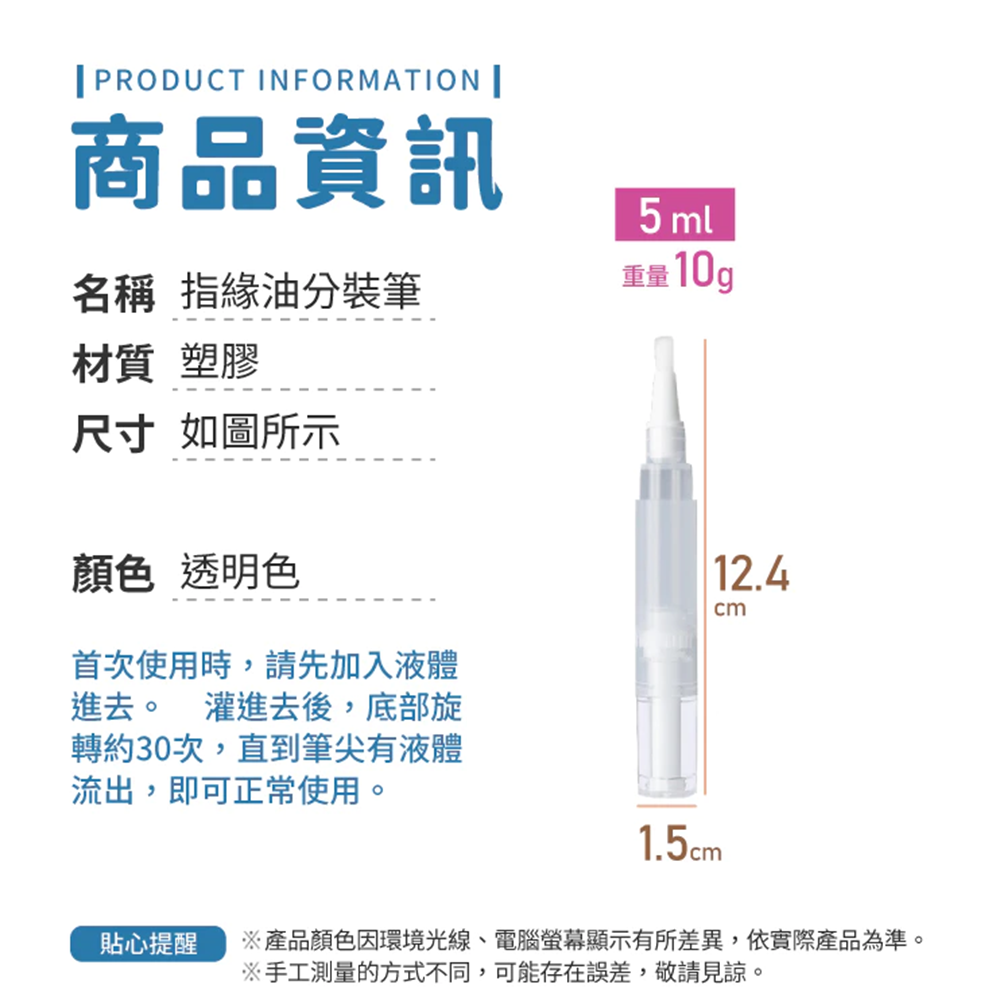 - 分裝筆設計精巧,可精準控制用量,避免浪費,讓您用得更省心。