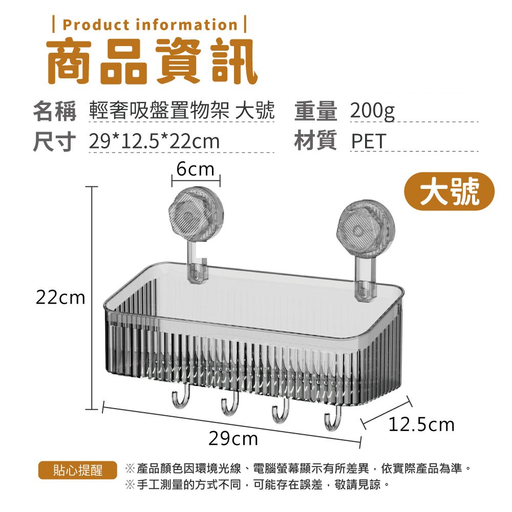 小麥購物輕奢吸盤置物架,採用優質PET材質,堅固耐用且透明美觀。這款置物架免釘安裝,利用吸盤即可輕鬆固定於牆面,不傷牆面且方便移動,讓您隨時調整收納位置。29*12.5*22公分的大尺寸設計,提供充足的收納空間,無論是浴室的洗漱用品、廚房的調味罐,還是客廳的小物件,都能輕鬆收納。底部掛鉤設計,方便懸掛毛巾、刷具等物品,讓您的空間更加整潔有序。透明灰色調,簡約時尚,輕鬆融入各種家居風格,提升生活質感。