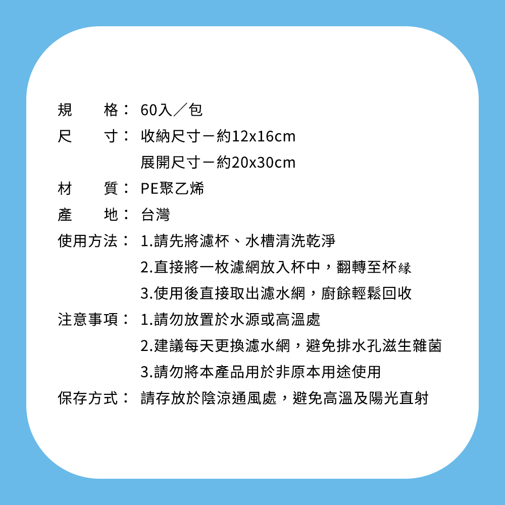 告別廚房水槽堵塞的煩惱!巧易潔多功能濾水網,採用優質PE材質,讓您安心使用。每包60個,展開尺寸30 x 20公分,輕鬆套在濾杯上,有效過濾菜渣、毛髮等雜物,保持排水暢通,避免異味產生。使用後直接丟棄,方便快捷,省時省力。台灣製造,品質保證,是您廚房清潔的好幫手!