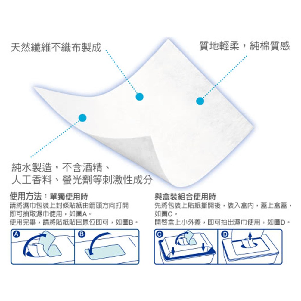 - 觸感輕柔的濕巾,呵護寶寶嬌嫩的肌膚,讓寶寶享受舒適的清潔體驗。