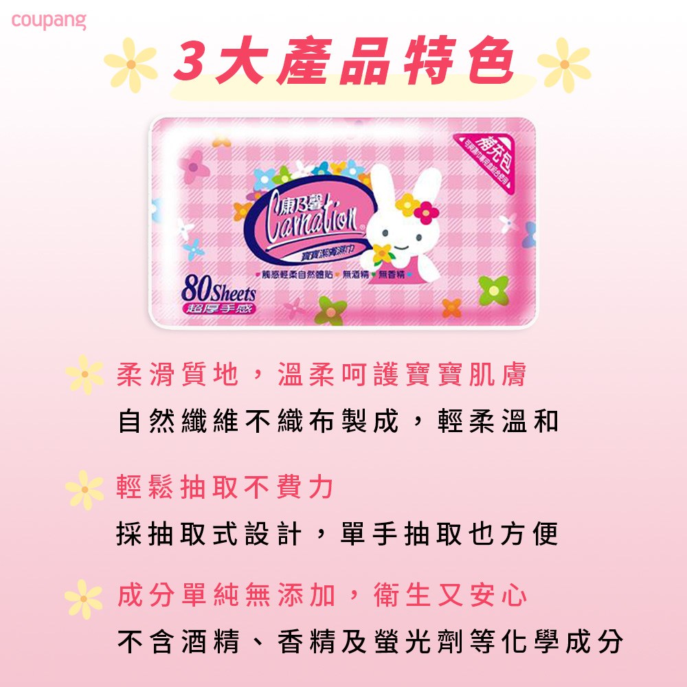 康乃馨寶寶濕巾補充包,呵護寶寶嬌嫩肌膚的理想選擇。每包含80張超厚手感的濕巾,給寶寶帶來輕柔舒適的觸感。採用純水製造,不含酒精、香精等刺激成分,溫和不刺激,讓媽媽更安心。抽取式設計,方便單手取用,隨時隨地保持寶寶清潔。補充包設計,是呵護寶寶的必備好物。