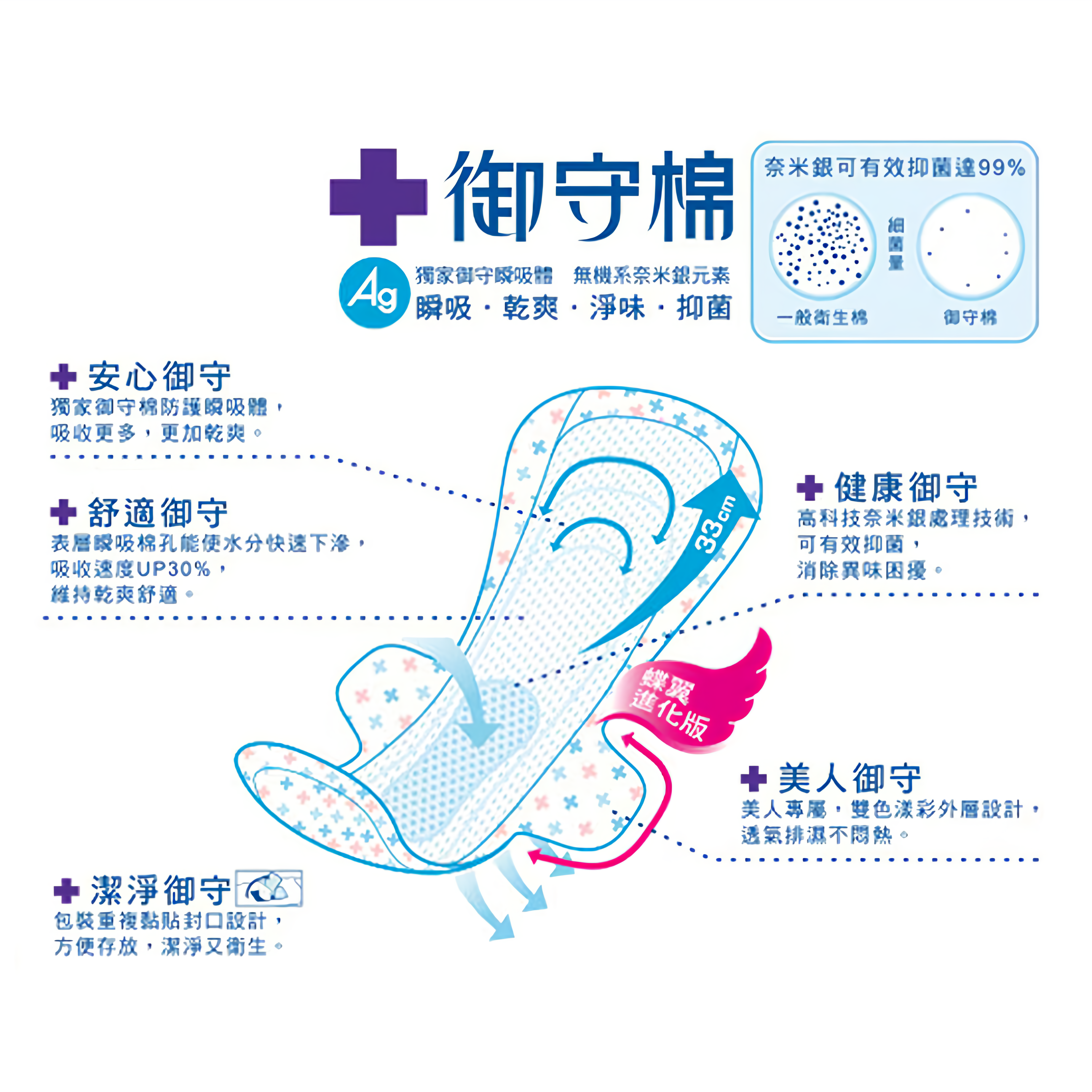 - 瞬吸鎖水層,快速吸收經血,保持乾爽,告別黏膩感,讓妳隨時清爽自在。