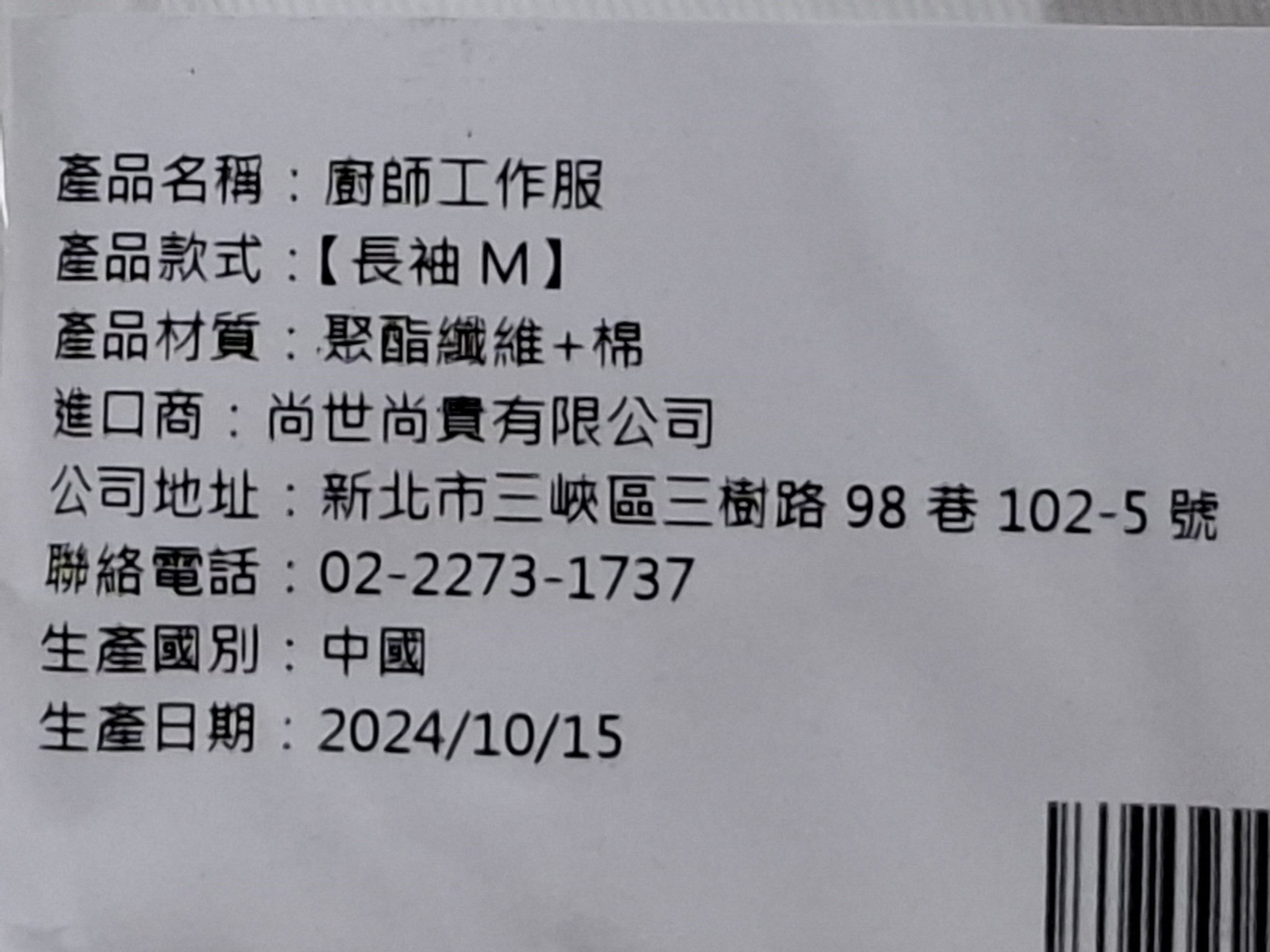 這款廚師工作服是您廚房工作的理想選擇。採用聚酯纖維和棉混紡面料製成,長袖設計,提供舒適耐穿的穿著體驗。白色系簡潔專業,M 尺寸適合多數體型。無論是專業廚師還是烹飪愛好者,這款工作服都能讓您在廚房中保持整潔和專業形象。尚世尚貫有限公司出品,品質保證,讓您買得安心。