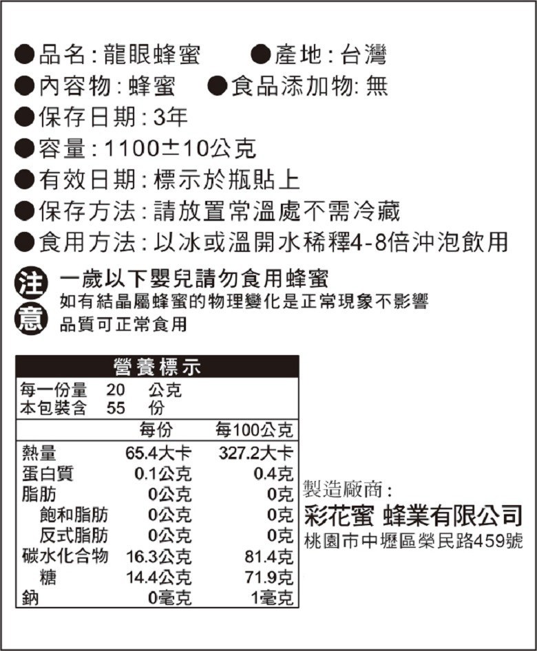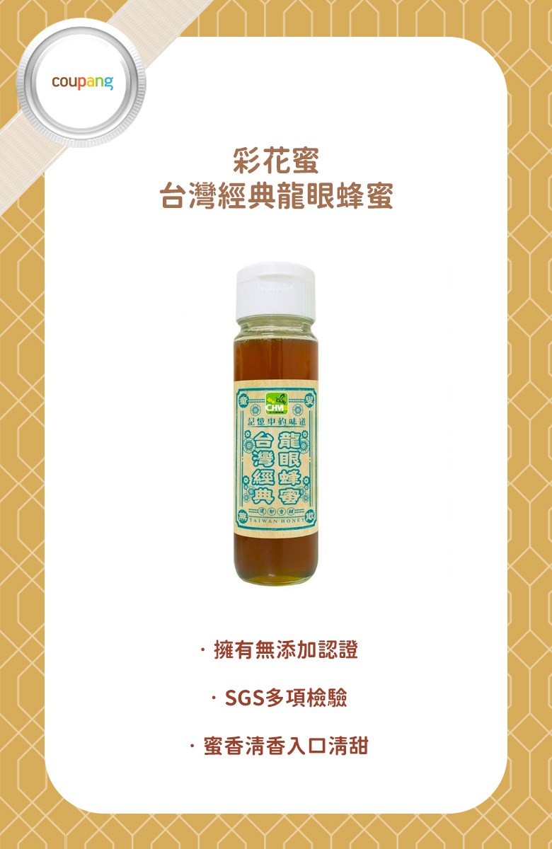 品嚐來自台灣的經典風味—彩花蜜台灣經典龍眼蜂蜜。這款1100克的龍眼花蜂蜜,未添加砂糖,並通過SGS檢驗,符合國家標準,讓您安心享用。無論是家庭或商業用途,這款蜂蜜都是理想之選。其獨特的龍眼花香,口感香甜,適合搭配冰水或溫開水沖泡飲用。彩花蜜以近40年的養蜂經驗,堅持提供高品質的蜂蜜,為您帶來健康美味的享受。