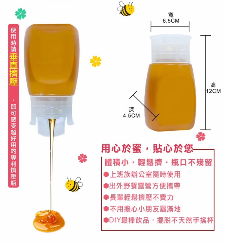 - 擠壓瓶設計,輕鬆控制用量,告別傳統蜂蜜沾手困擾,享受優雅取蜜體驗。