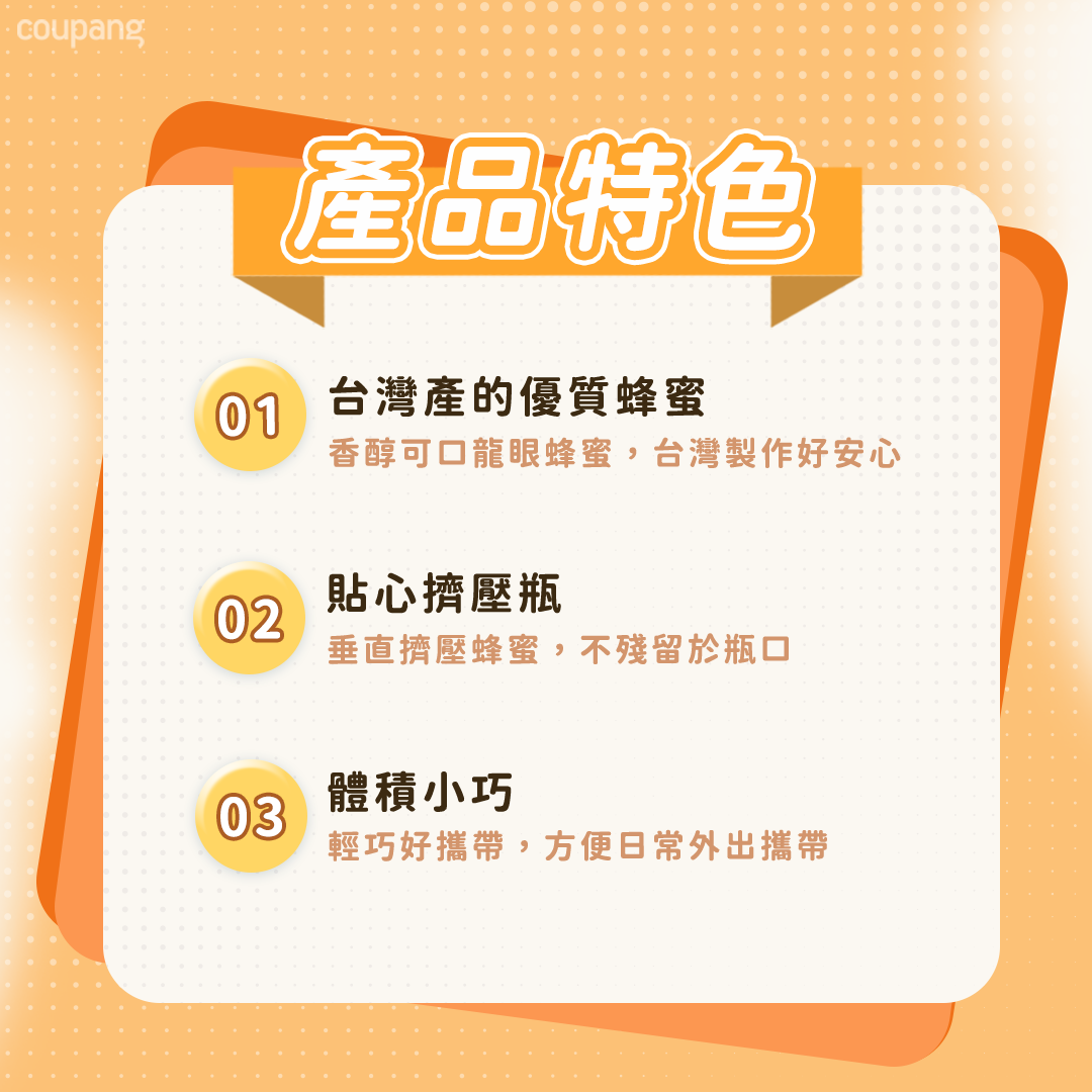 - 採用擠壓瓶設計,使用方便不沾手,輕鬆控制用量,讓您隨時享受美味蜂蜜,方便又衛生。