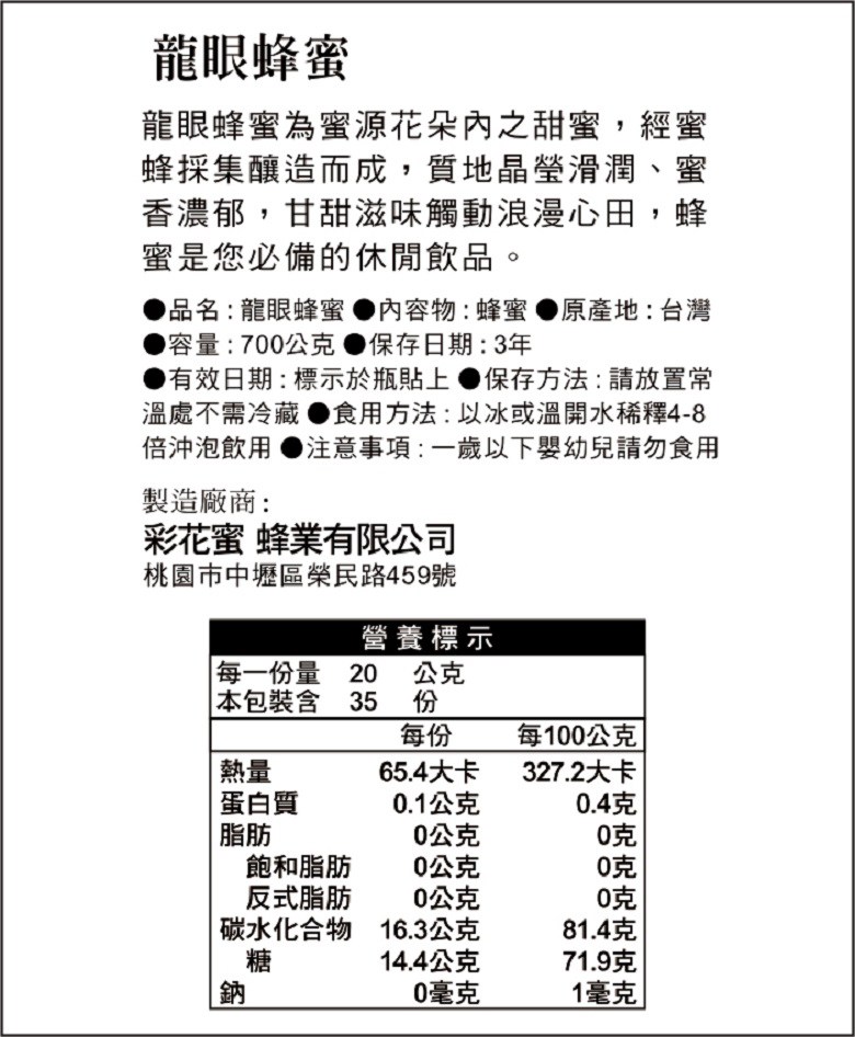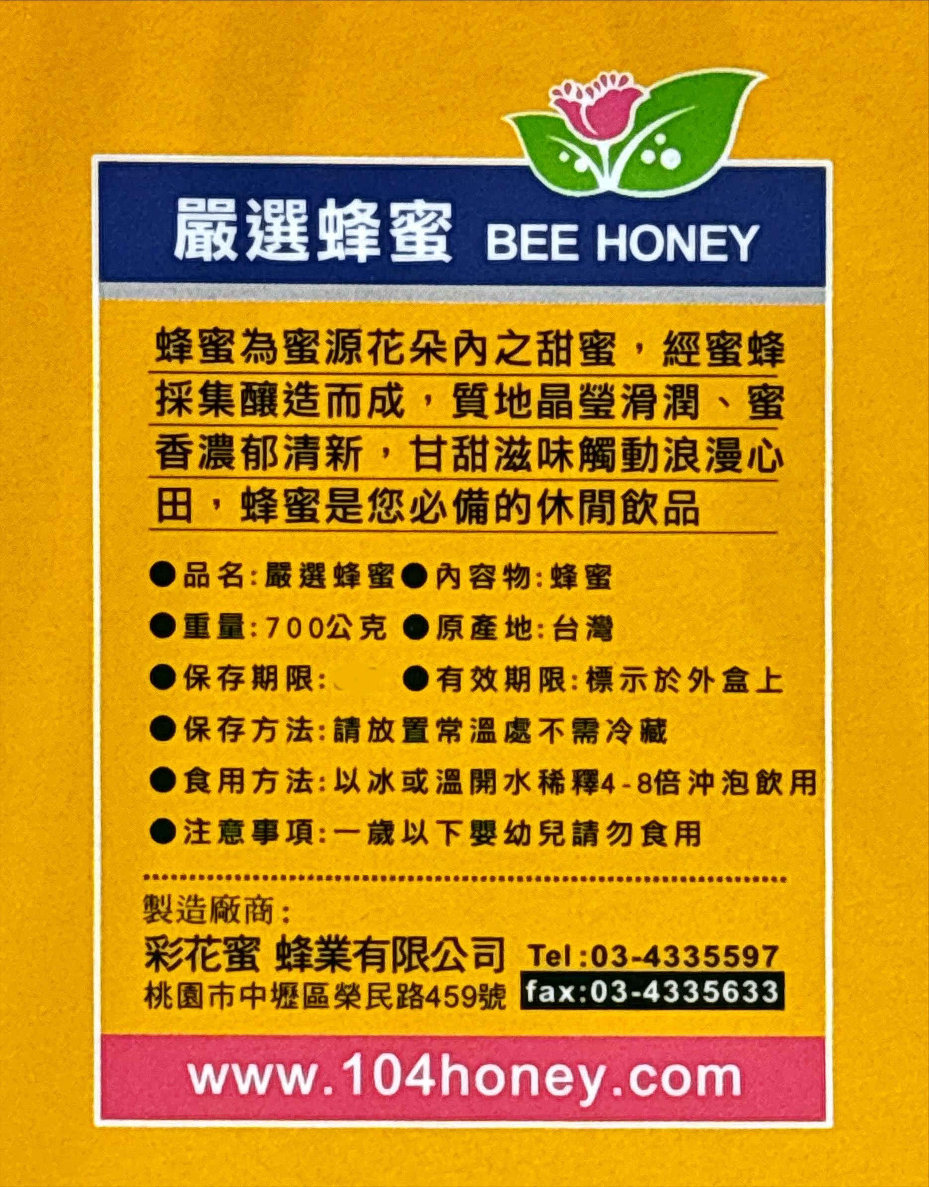 品嚐來自台灣的純正風味,彩花蜜台灣龍眼蜜,每一滴都蘊含著大自然的精華。這款700g的龍眼蜜,是由蜜蜂採集龍眼花蜜釀製而成,口感香醇濃郁,帶有獨特的龍眼花香。經過SGS多項檢驗,無添加任何人工成分,保證您和家人的健康。無論是沖泡飲用、塗抹麵包,都能為您的生活增添一份甜蜜與健康。選擇彩花蜜,讓您品嚐到最道地的台灣好滋味。