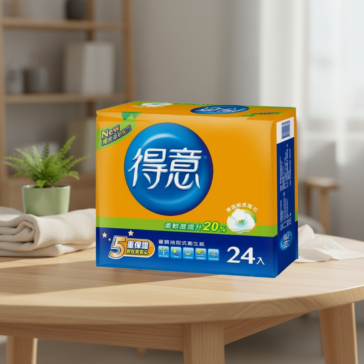 - 得意抽取式衛生紙,觸感細緻,給您如絲綢般的柔滑體驗,呵護您的每一寸肌膚。