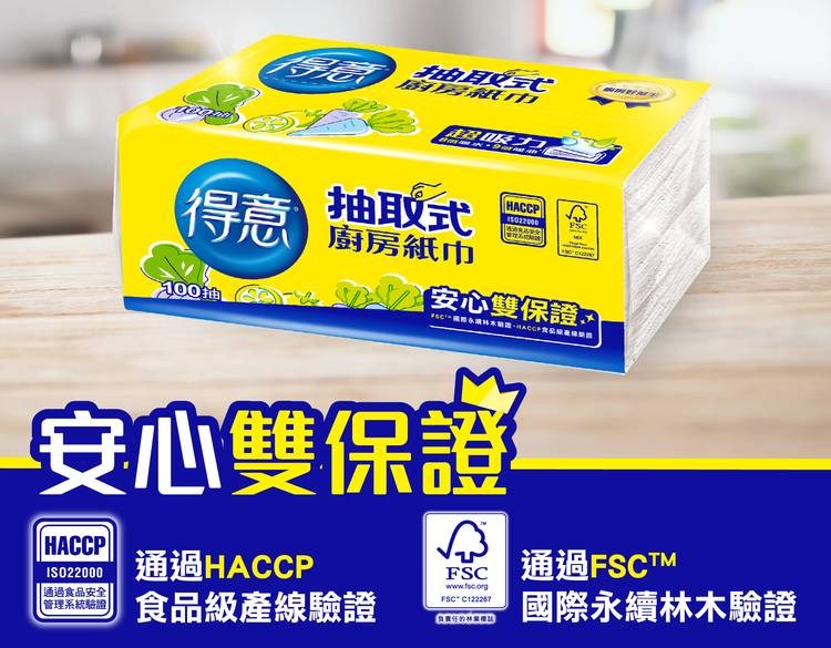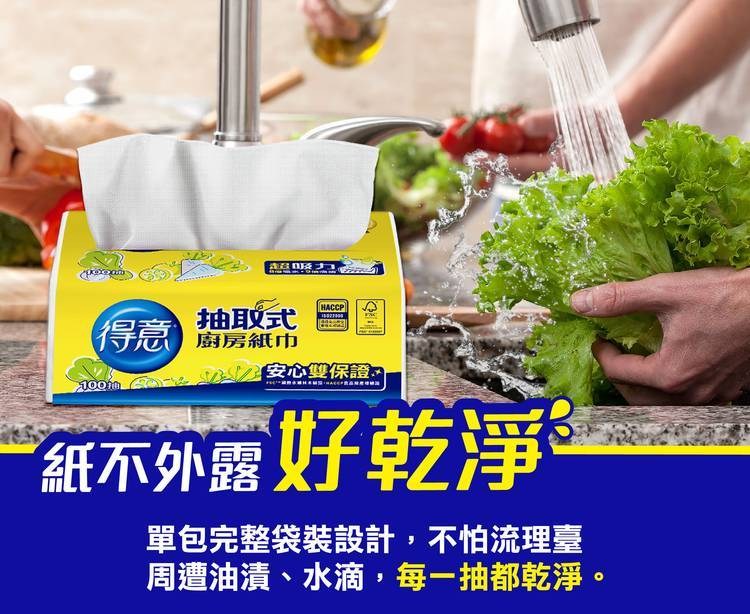 得意抽取式廚房紙巾,箱裝30包入,是您廚房清潔的好幫手。採用抽取式設計,方便單手取用,告別傳統捲筒式廚房紙巾需要雙手撕取的困擾,不含螢光劑,讓您安心使用。超強吸水力,輕鬆吸除廚房油污和水漬,保持檯面乾淨衛生。通過HACCP食品級產線驗證和FSC國際永續林木驗證,品質安心有保障。一次性使用,避免抹布重複擦拭帶來的細菌滋生,讓您的廚房更加潔淨。