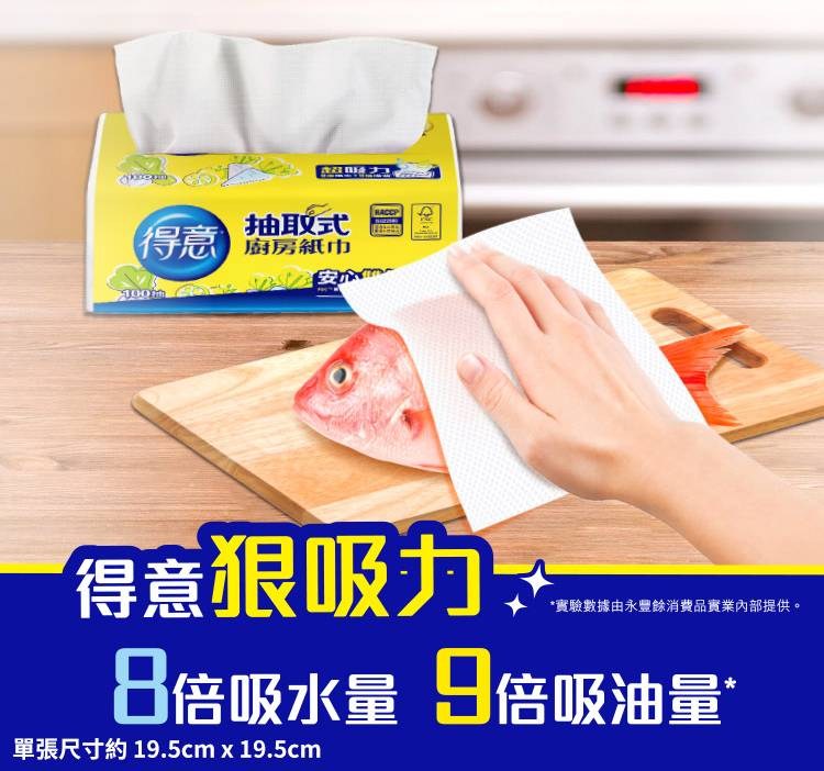 - - 廚房清潔好幫手,得意紙巾快速吸水吸油,輕鬆擦拭檯面油污,保持廚房乾淨。