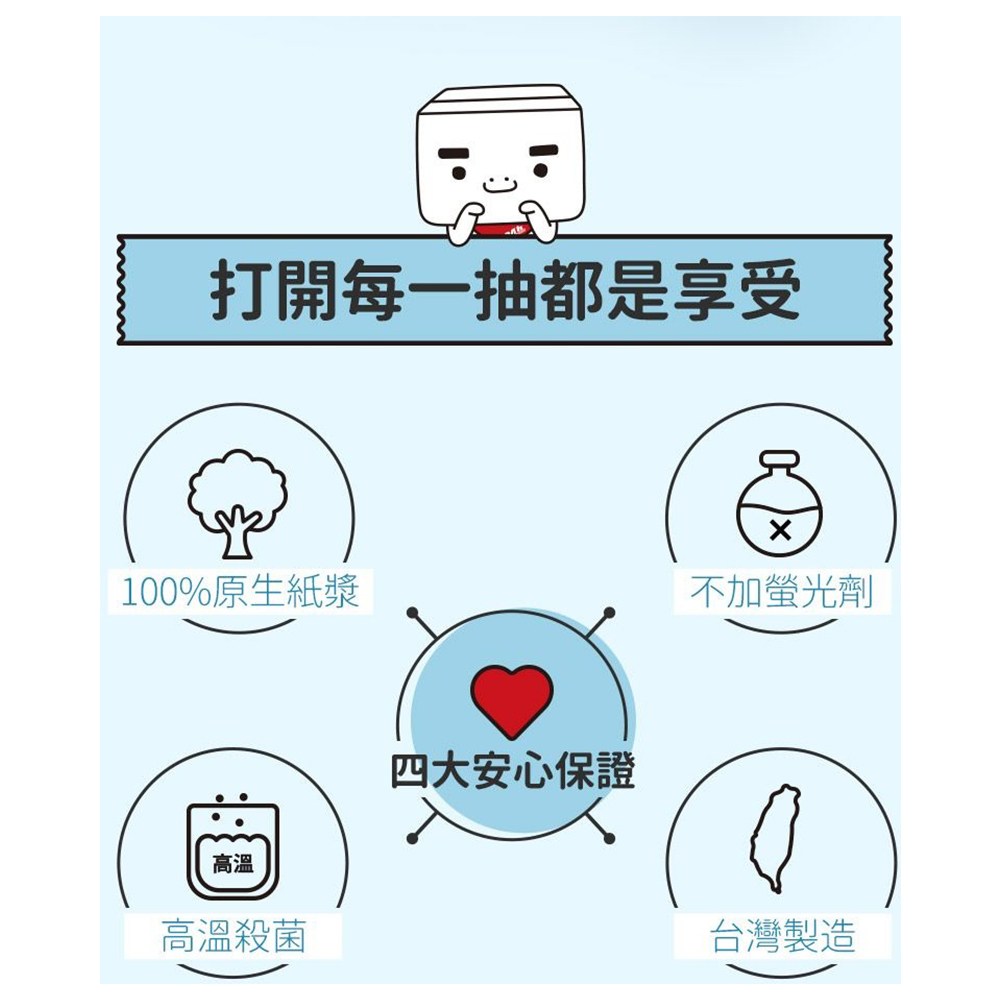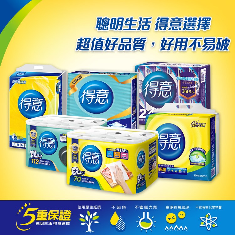 - 得意抽取式衛生紙,紙質細緻柔軟,給您如面紙般的舒適觸感,使用後不易留棉絮。