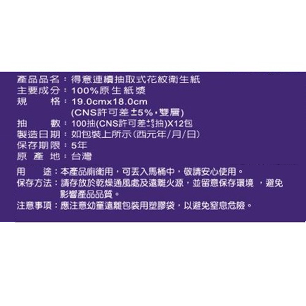 得意連續抽取式花紋衛生紙,採用全新升級壓紋技術,觸感柔軟細緻,給您帶來極致舒適的體驗。嚴選原生紙漿,不含螢光劑等有害物質,使用更安心,呵護您的健康。連續抽取設計,方便抽取不浪費,讓您輕鬆享受潔淨生活。花紋設計美觀大方,為您的居家環境增添一份優雅氣息。超值大容量包裝,滿足您的長期需求,是您居家、辦公室或外出的潔淨好幫手。