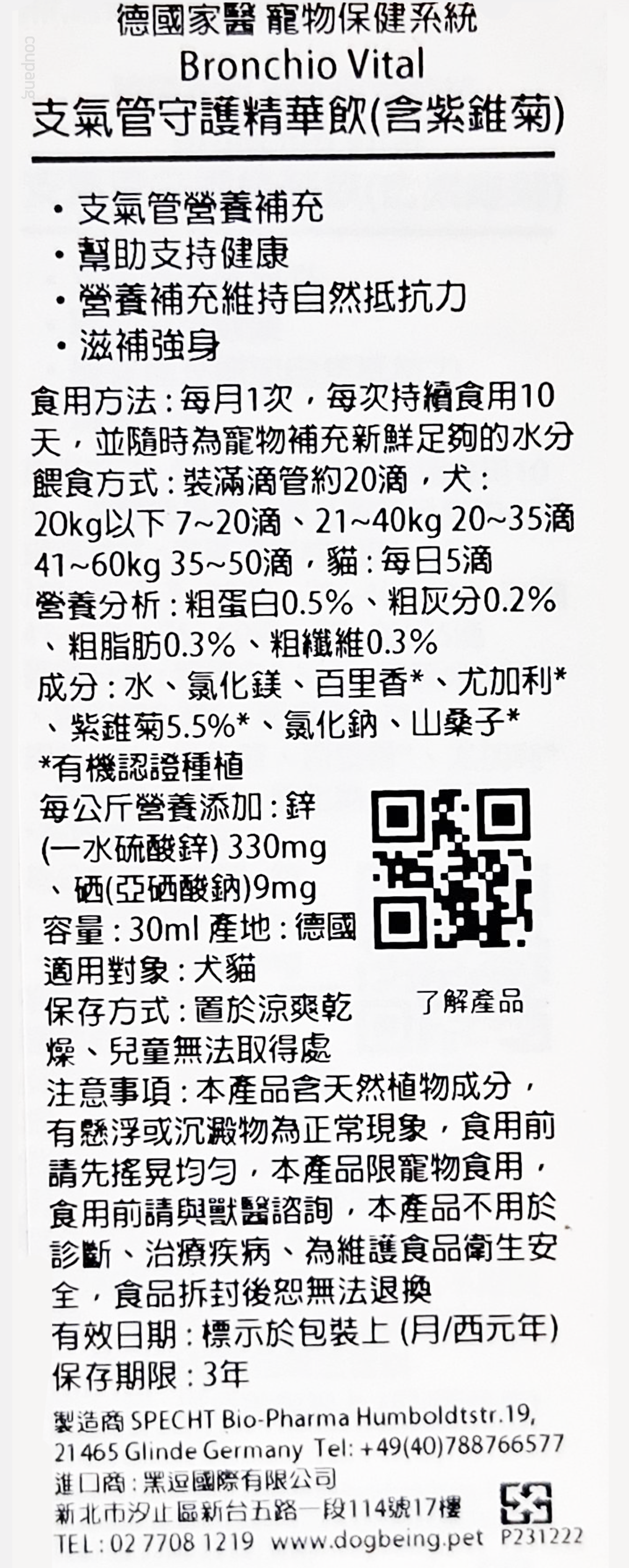呵護毛孩呼吸道健康,德國原裝進口德國家醫支氣管守護精華飲,為您的愛犬愛貓提供專業級的支氣管保健,有助於舒緩呼吸不適,維持呼吸道機能健康。每瓶30ml,方便餵食,即可輕鬆補充營養。本產品不含防腐劑、香料及化學物質,安全無負擔,讓您的毛孩呼吸順暢,活力充沛!