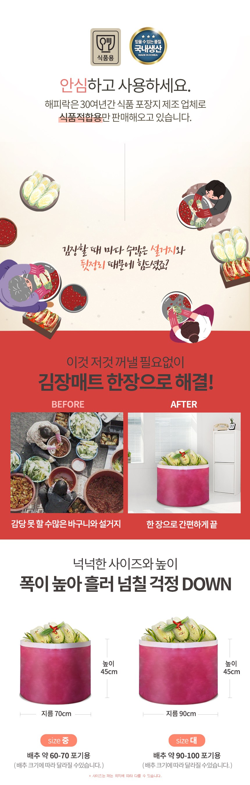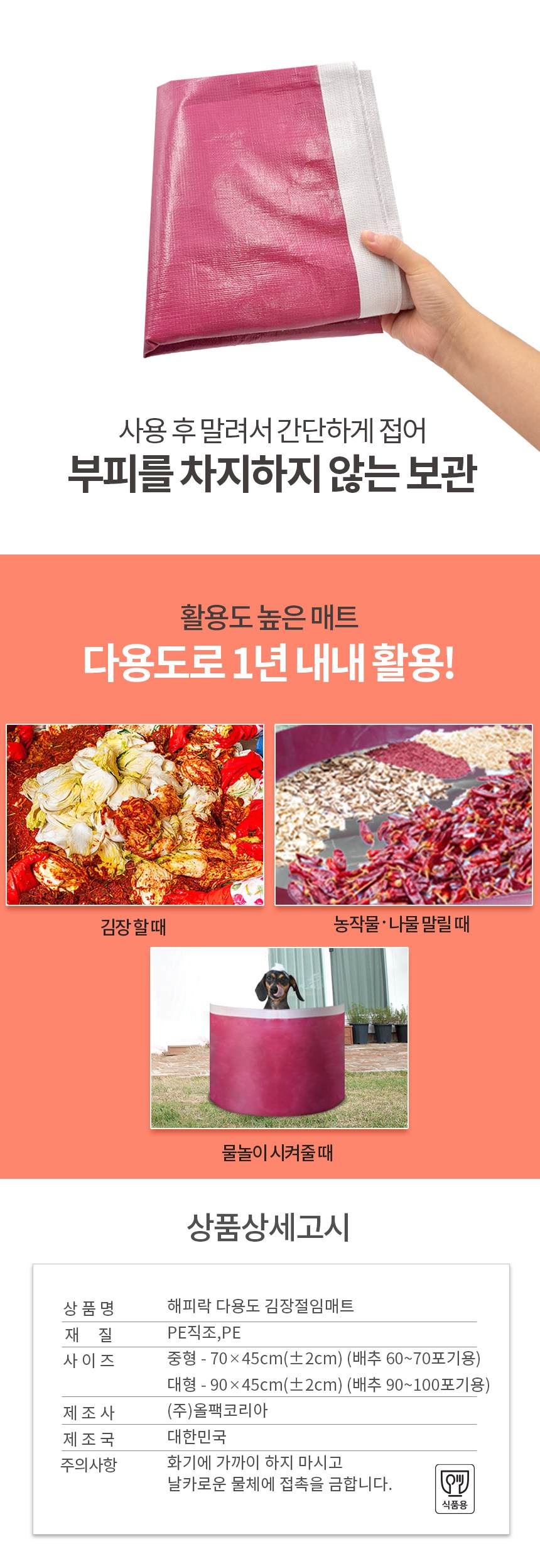 Happy lock泡菜印花多用墊是您製作韓式泡菜的理想選擇。採用食品級PE編織材質,安全可靠,讓您使用。加高設計,有效防止醃製過程中食材溢出,保持廚房清潔。除了醃製泡菜,還可用於晾曬農作物、蔬菜,甚至戶外玩水,是一款多功能的實用墊子。使用後易於清潔,簡單折疊即可收納,不佔空間。韓國製造,品質值得信賴。