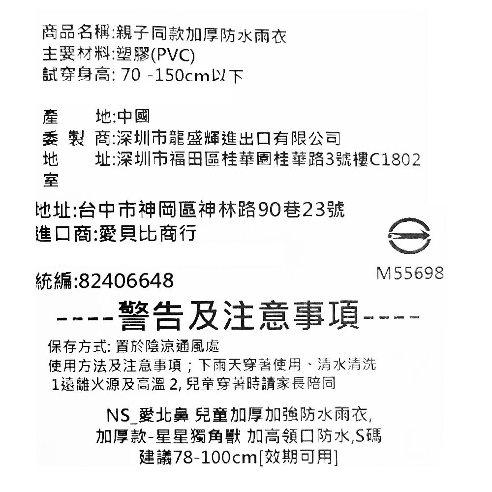 愛北鼻親子同款加厚防水雨衣,採用可愛的星星獨角獸圖案,讓孩子在雨天也能展現獨特魅力。加厚防水材質,有效阻擋雨水滲透,保持乾爽舒適。親子同款設計,讓家長與孩子一同穿著,共享雨中漫步的溫馨時光。S碼建議身高78~100公分,讓孩子穿著更合身,活動自如不受拘束。輕巧易攜帶,方便收納,隨時應對突如其來的雨天。
