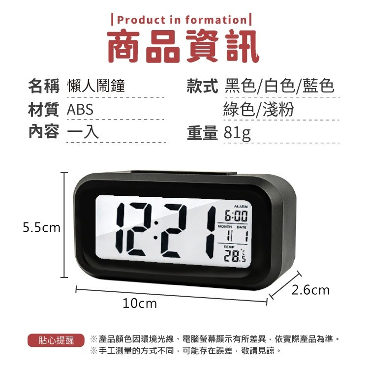 這款懶人鬧鐘,簡約白色設計,尺寸為10 x 5.5 x 2.6公分,輕巧不佔空間,一次購買即有兩個,方便您放置於不同房間或作為備用。清晰的LCD螢幕顯示時間、日期和溫度,讓您隨時掌握重要資訊。貪睡功能讓您在清晨享受額外的幾分鐘休息,頂部按鈕一按即可輕鬆貪睡。ABS材質堅固耐用,確保產品長久使用,是您居家生活的實用好幫手。