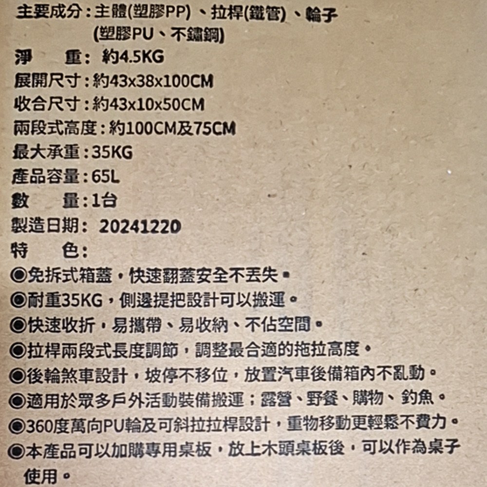- 四輪設計讓您輕鬆拖行,露營裝備不再是負擔,享受戶外樂趣。