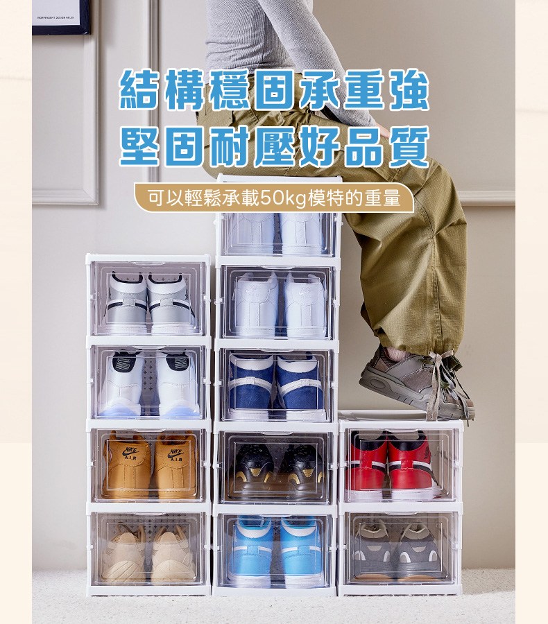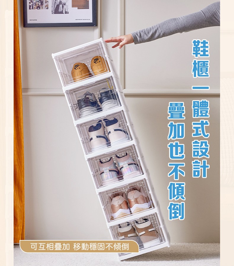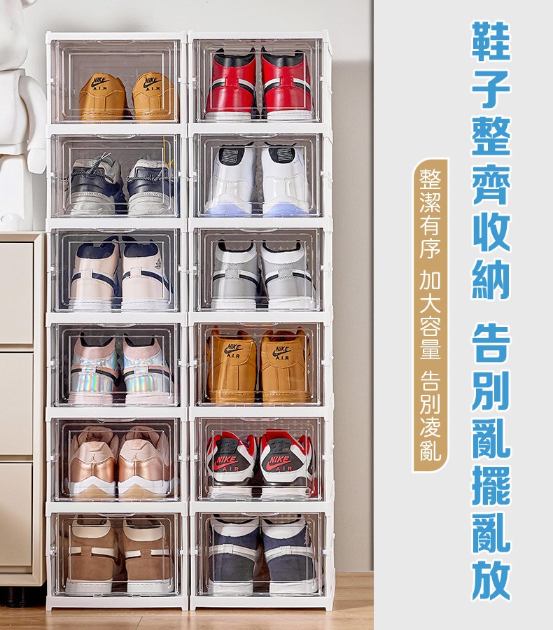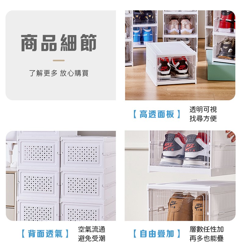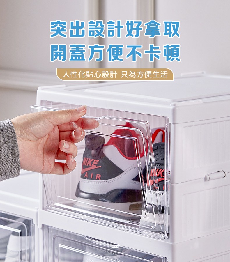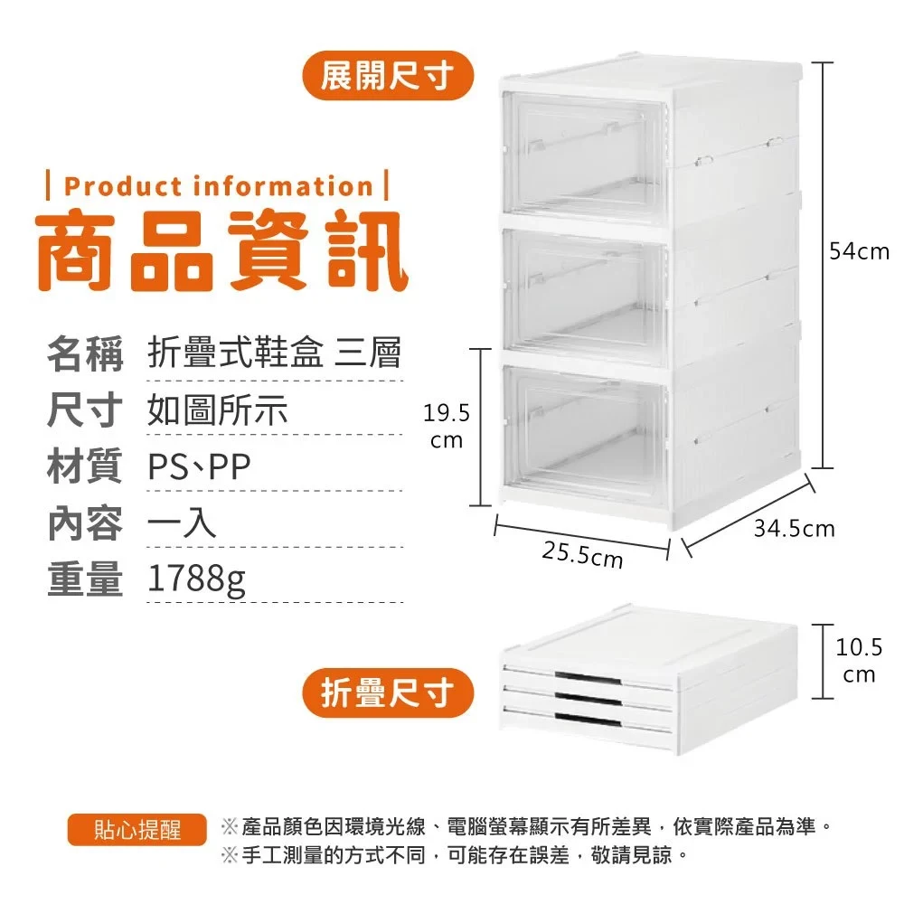 這款折疊式鞋盒,型號B051,採用PS和PP材質製成,堅固耐用且易於清潔。三層設計提供充足的儲物空間,讓您的鞋子整齊有序地擺放,告別凌亂。其透明門板設計,方便您快速找到所需的鞋子,節省時間。無需組裝,一秒展開即可使用,輕鬆方便。尺寸為54cm高 x 25.5cm寬 x 34.5cm深,落地式設計穩固可靠,為您的家居生活增添一份整潔與便利。