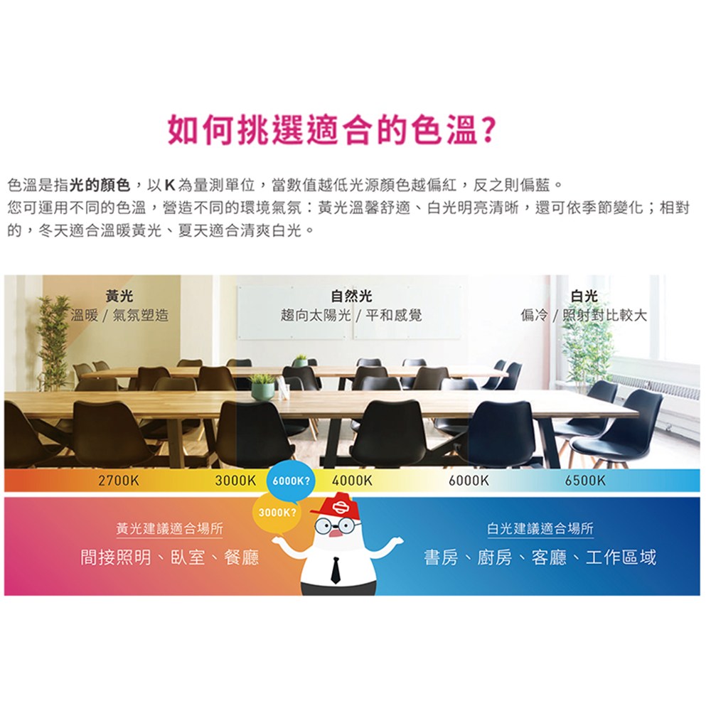 - 白光提供清晰明亮的照明效果,適合辦公室、書房等需要集中精神的場所。