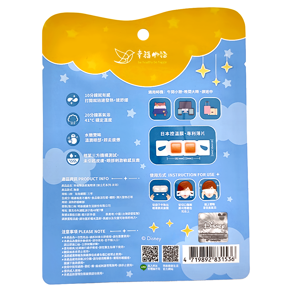 明基健康生活幸福物語迪士尼蒸氣眼罩,米奇款,是您舒緩眼部疲勞的最佳選擇。這款眼罩採用親膚材質,觸感輕柔舒適,能溫和呵護您的眼部肌膚。獨立包裝設計,方便您隨時隨地享受蒸氣SPA。無香型設計,適合對香味敏感的您。三盒裝,讓您和家人朋友一同分享,享受舒適的眼部護理體驗。可愛的米奇圖案,讓您在睡眠中也能享受童趣。