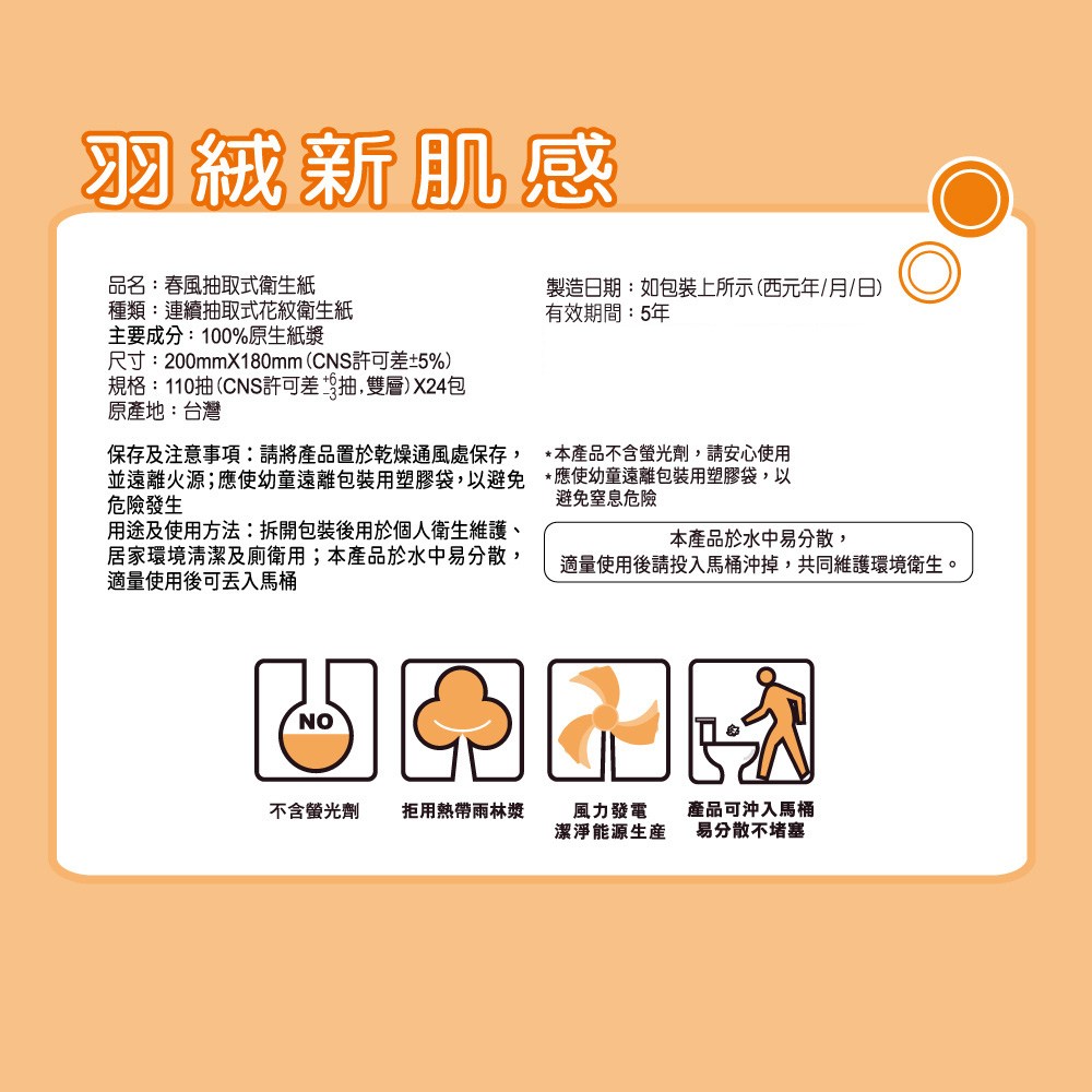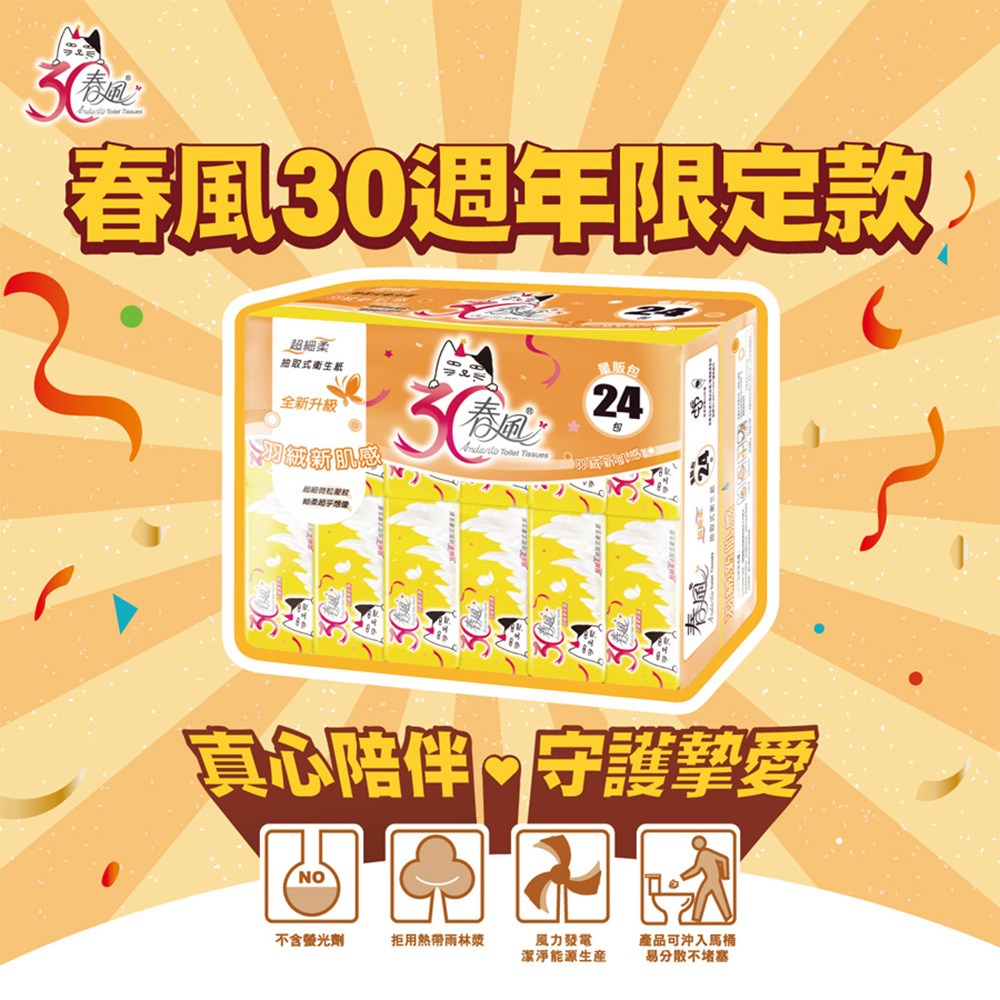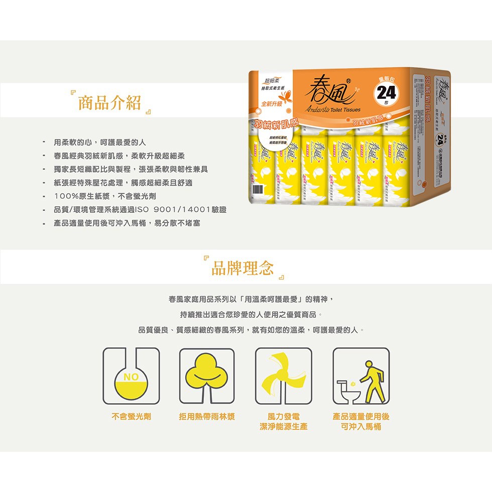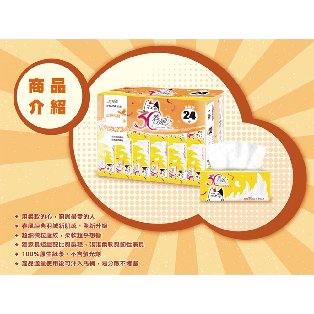 春風抽取衛生紙,呵護您和家人的每一寸肌膚。這款衛生紙採用100%原生紙漿,不含螢光劑,讓您使用安心。獨家長短纖配比與製程,使紙張柔軟升級超細柔,觸感輕柔舒適。每包含有110張抽取式衛生紙,一袋共有24包,量販包裝,滿足您的日常需求。紙張經過特殊壓花處理,加強吸水力,且產品適量使用後可沖入馬桶,不易造成堵塞。