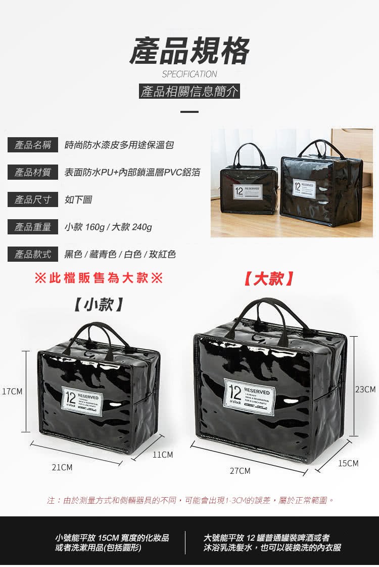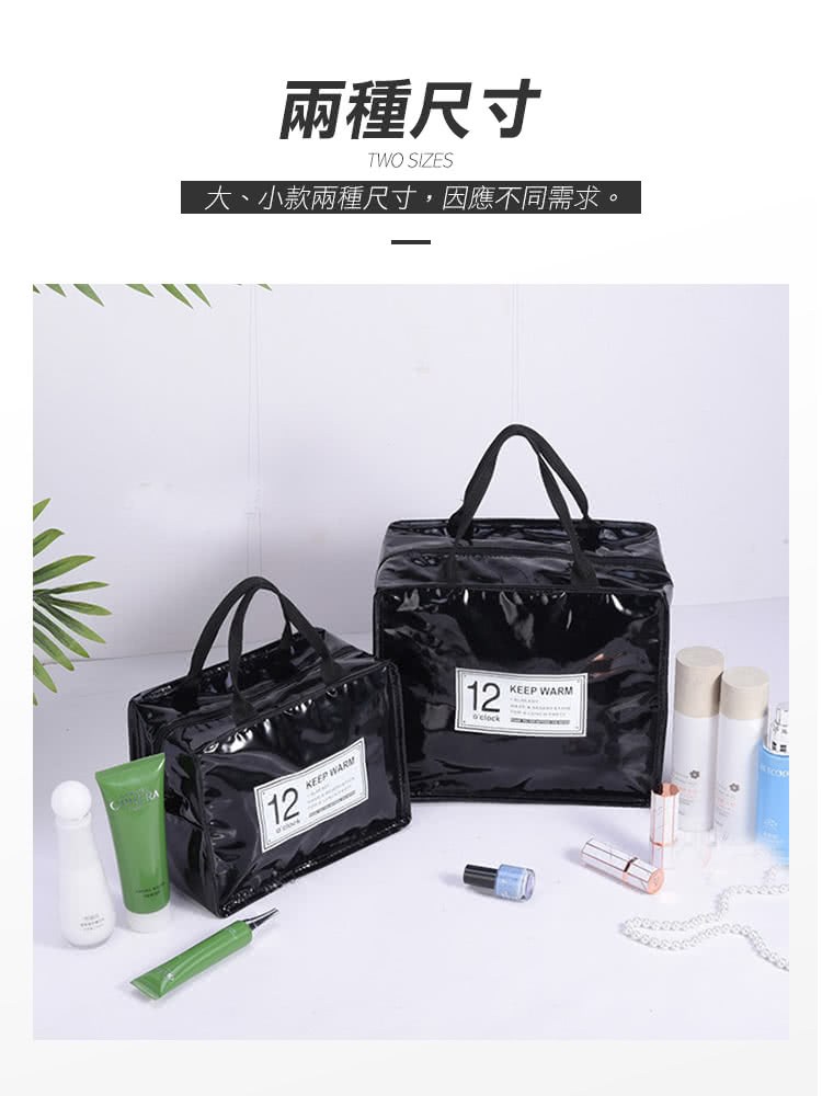 這款時尚防水漆皮多用途保溫收納包,大款黑色,尺寸為27 x 15 x 23公分,是您午餐和購物時的理想選擇。採用表面防水PU和內部鎖溫層PVC鋁箔材質,不僅防漏防水,還能有效保溫隔熱,讓您隨時享受美味。包包設計簡約時尚,黑色素色外觀更顯質感,無論上班、上學或外出野餐都非常適合。配有軟墊提把,舒適好提,拉鍊式上鎖/固定方式,安全可靠,易於清潔,只需用濕布擦拭即可。容量為3L,足夠收納您的日常所需,讓您的生活更加便利。