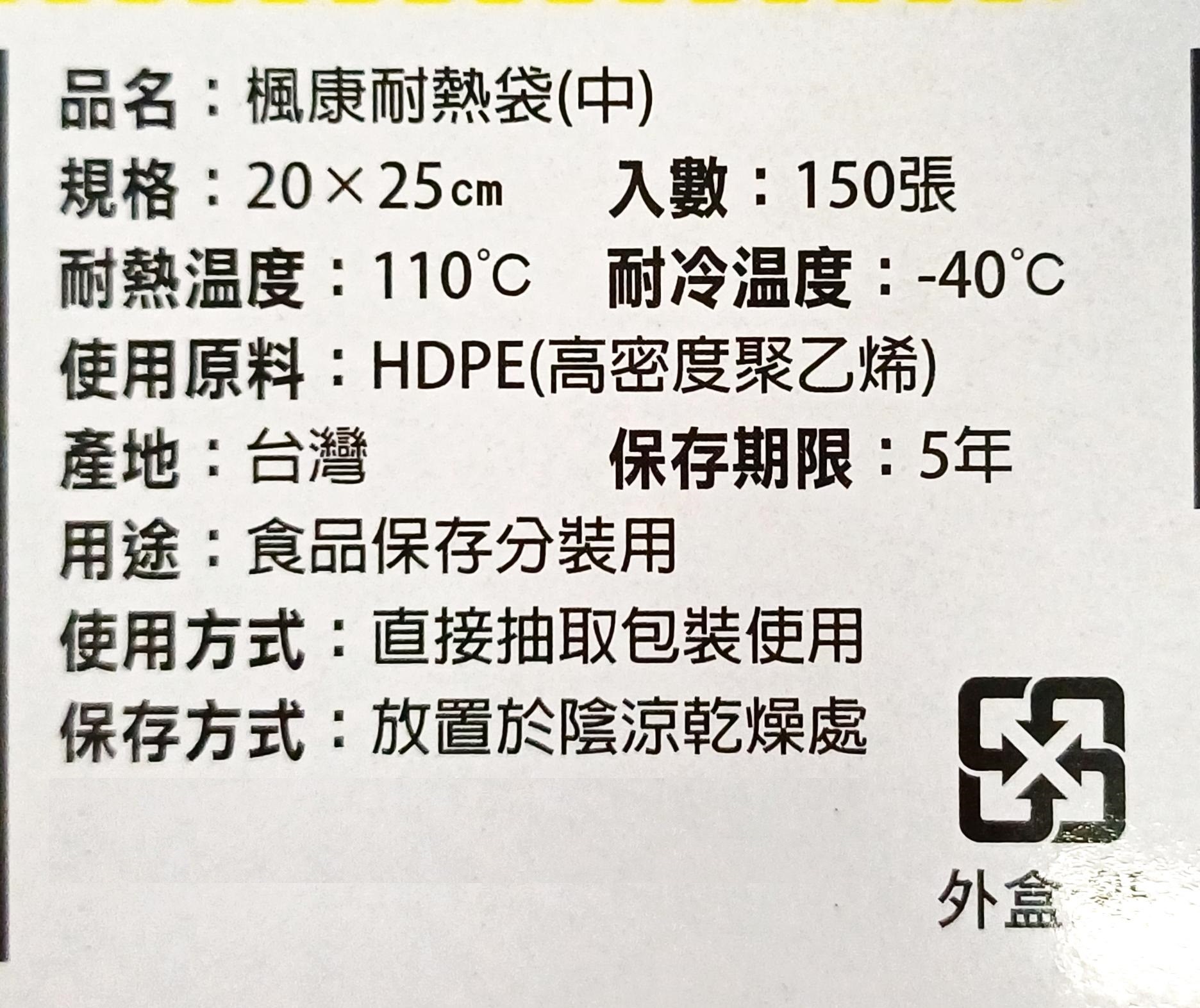 楓康耐熱袋,台灣製造,品質安心可靠。每包含有150個中型尺寸的耐熱袋,尺寸為20*25公分,適用於食品分裝、冷藏冷凍等多種用途。採用全新塑料材質製造,無塑化劑、無味無添加,符合美國FDA、中華民國食品容器檢驗標準,讓您使用更放心。耐熱溫度達110℃,耐冷溫度達-40℃,無論是熱食或冷凍食品皆可安心使用。抽取式設計,方便抽取使用,是您廚房不可或缺的好幫手。