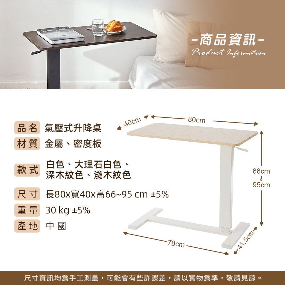 樂嫚妮無段式升降氣壓桌,是您居家生活的好幫手。這款可折疊收納的邊桌,採用氣壓式升降設計,讓您輕鬆調整高度,滿足不同使用需求。白色簡約外觀,能完美融入各種居家風格。80公分寬桌面,提供足夠的空間,無論是工作、閱讀或用餐都非常方便。可折疊設計,更方便收納,節省空間。