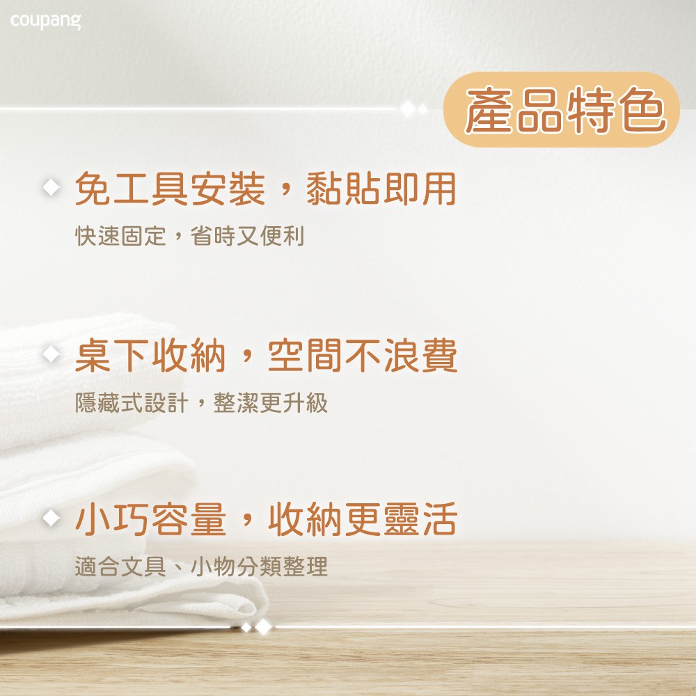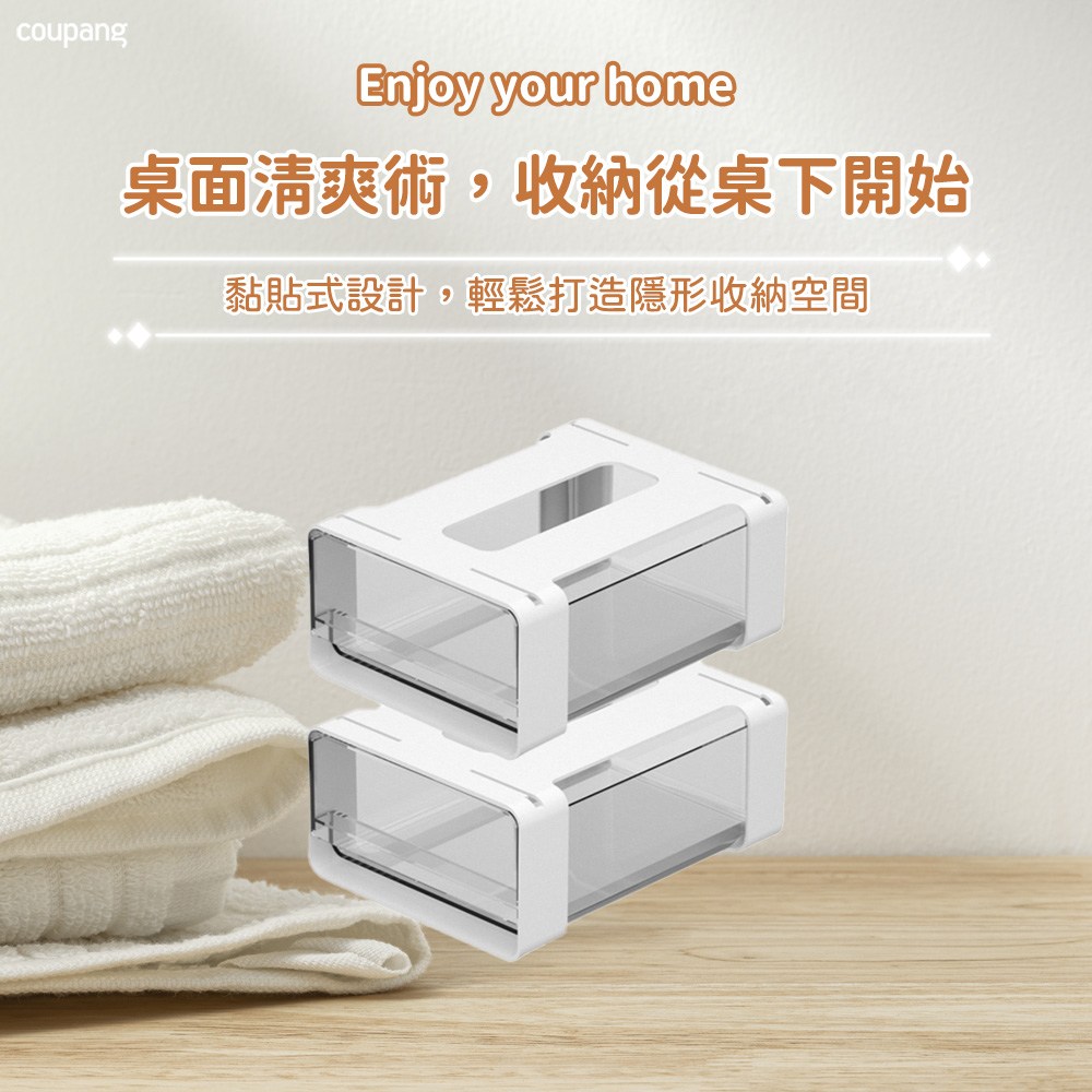 - 免工具黏貼設計,輕鬆安裝於桌面下方,快速打造隱藏式的收納空間,保持桌面整潔。