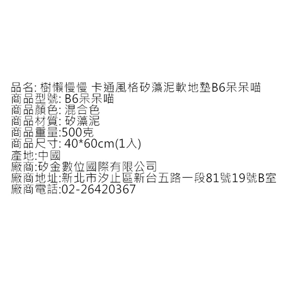 樹懶慢慢 卡通風格 矽藻泥 B6 呆呆喵 浴室吸水防滑軟地墊 60 x 40cm, 1個