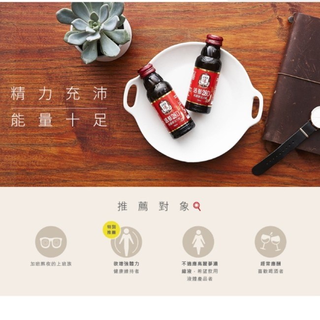 - 嚴選六年根高麗蔘精華,為您注入源源不絕的活力,精神旺盛每一天。