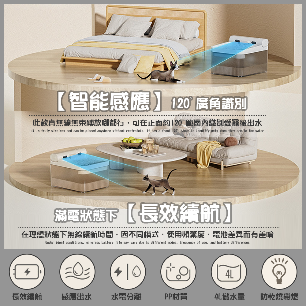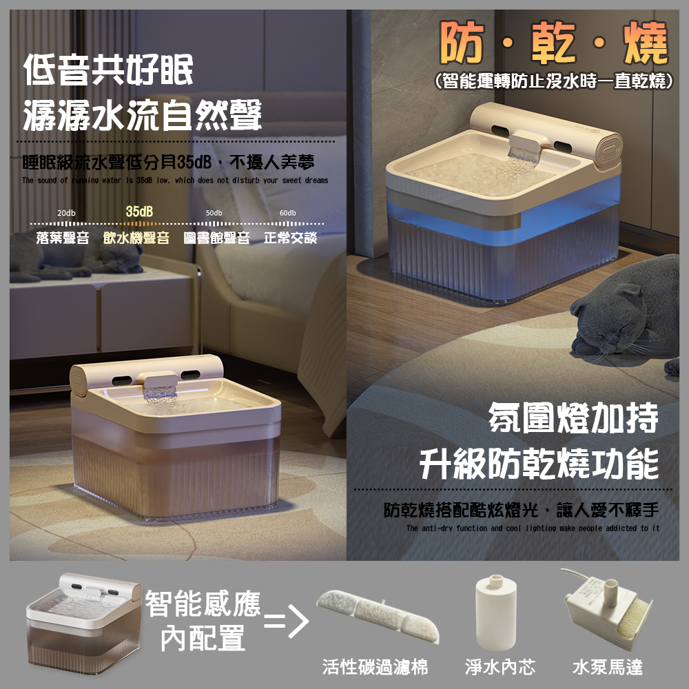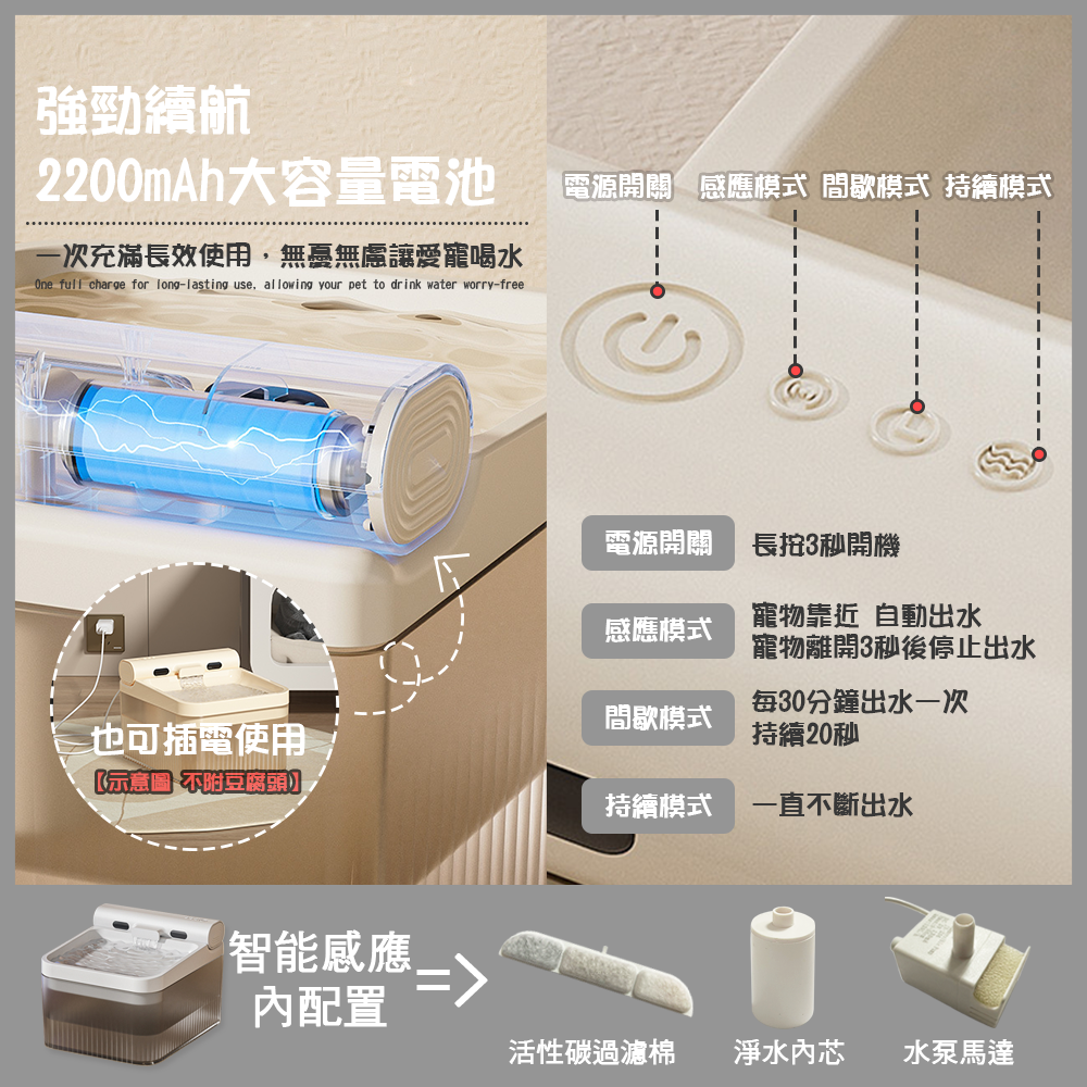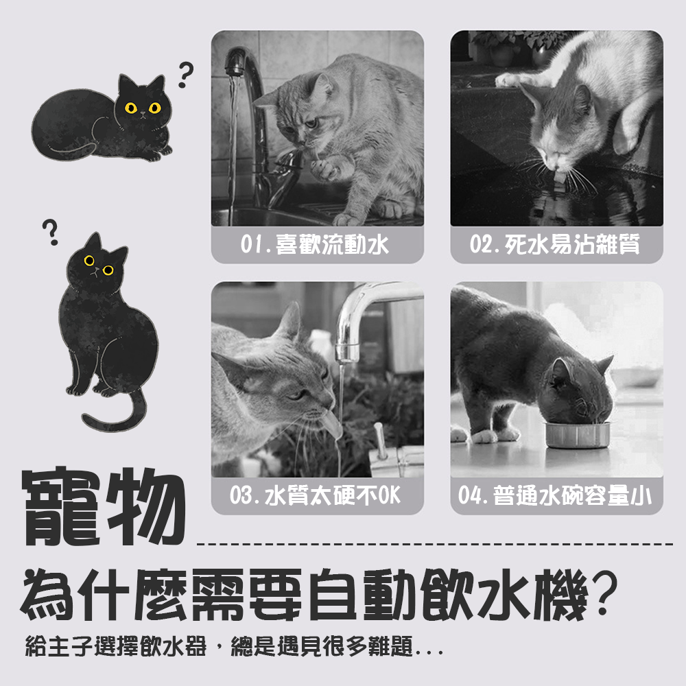 - 智能感應設計,寵物靠近即自動出水,提供新鮮流動水源,吸引牠們多喝水。