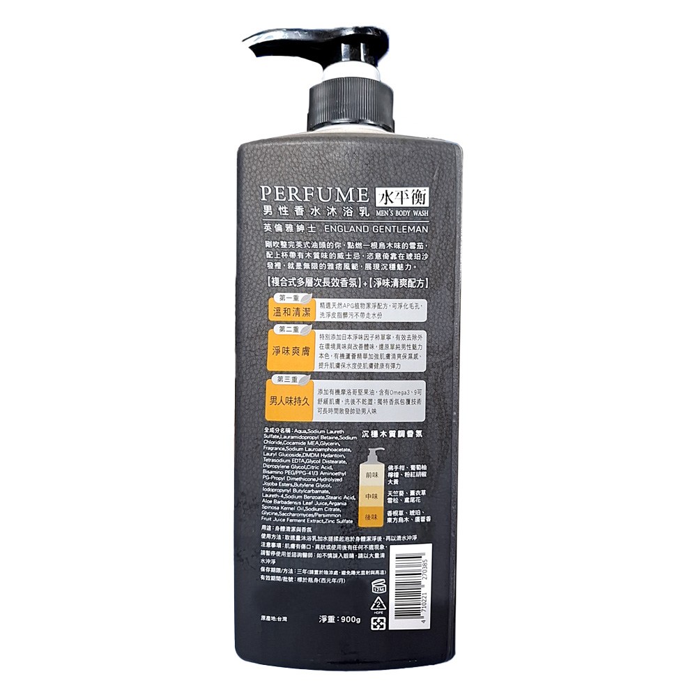 水平衡男性香水沐浴乳英倫雅紳士,是一款專為男士設計的沐浴產品,容量為900g。此款沐浴乳散發著沉穩木質香調,彷彿置身於英倫紳士的優雅氛圍中。其獨特配方能溫和潔淨肌膚,去除污垢和多餘油脂,同時保持肌膚水分平衡,洗後不乾澀。蘊含多重保濕成分,有助於提升肌膚的保水度,使肌膚健康有彈性。讓您在沐浴的同時,享受香氛帶來的愉悅感,展現自信魅力。