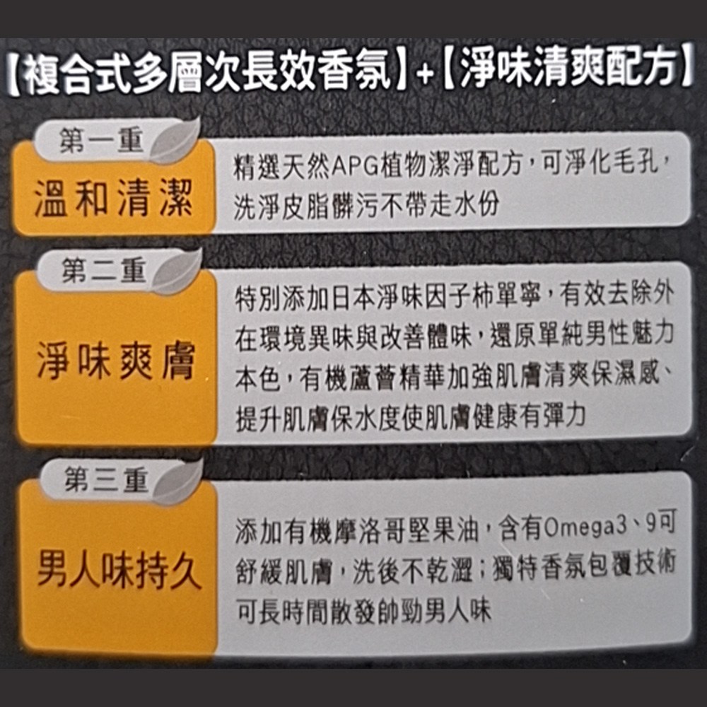 - 沐浴後散發持久木質香氣,展現成熟男士的魅力,讓您自信一整天。