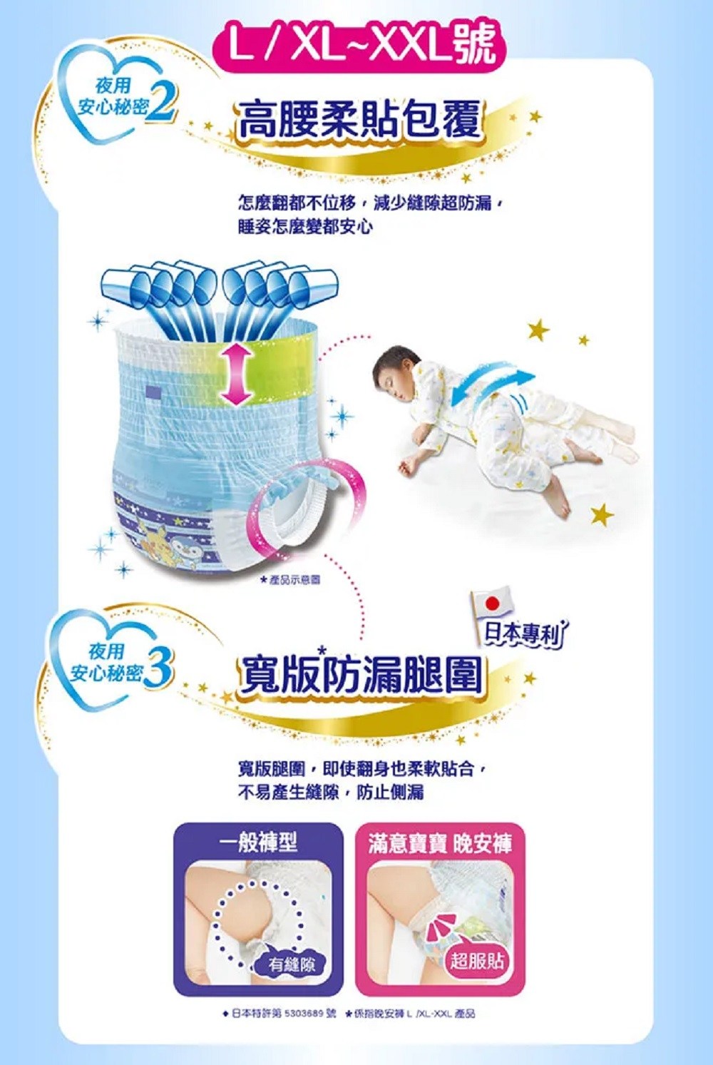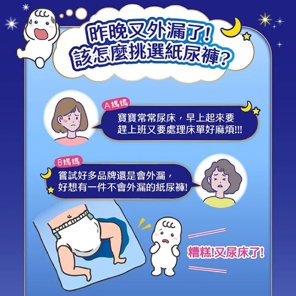 - 超強力吸收設計,整夜乾爽舒適,讓寶寶安穩睡眠至天亮,媽媽安心。