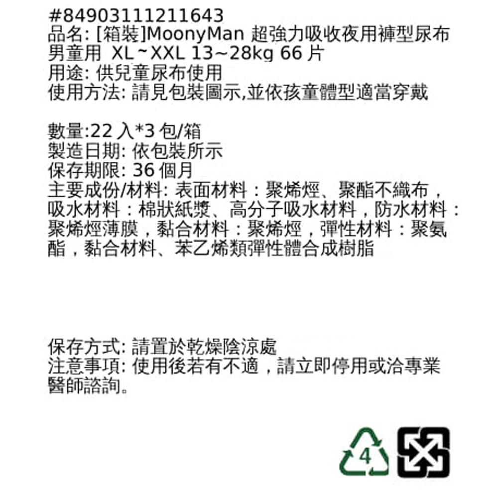 MoonyMan超強力吸收夜用褲型尿布,專為男童設計,讓寶寶夜晚安睡無憂。XL~XXL尺寸,適用於13~28公斤的寶寶,每箱包含66片,提供長效保護。這款褲型尿布採用超強吸收材質,能有效鎖住尿液,讓寶寶整夜乾爽舒適。獨特設計符合男童生理特點,提供更佳的貼合度和舒適度。選擇MoonyMan,給寶寶一個安心舒適的夜晚,媽媽也更放心。