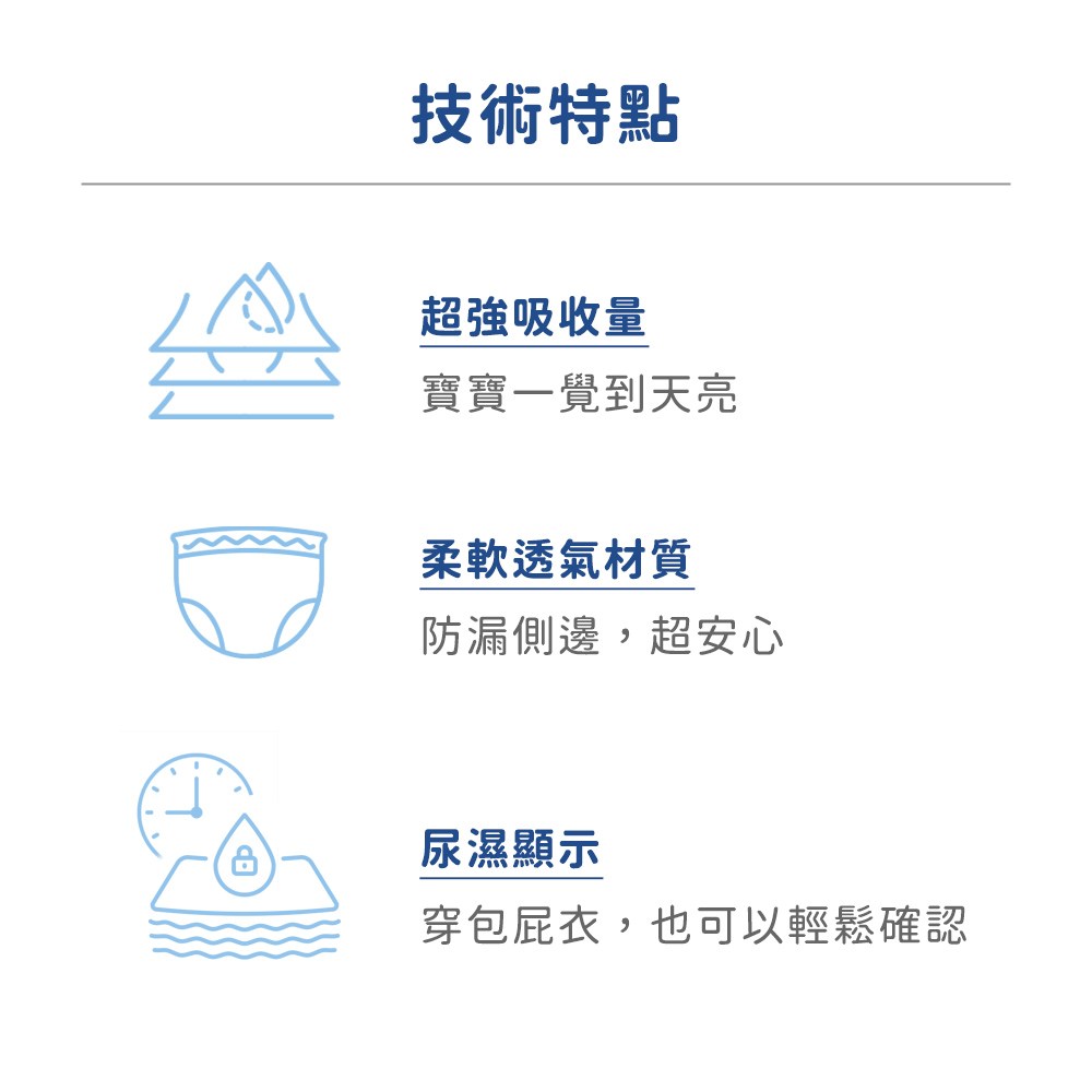 - 針對男童設計,加強吸收力,有效防止側漏,給寶寶整夜乾爽舒適。