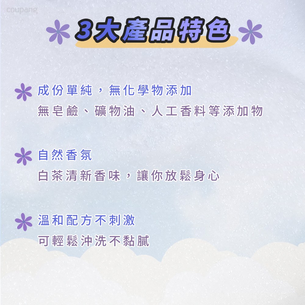 - 沐浴後散發淡淡白茶香,舒緩身心,享受沐浴好時光。