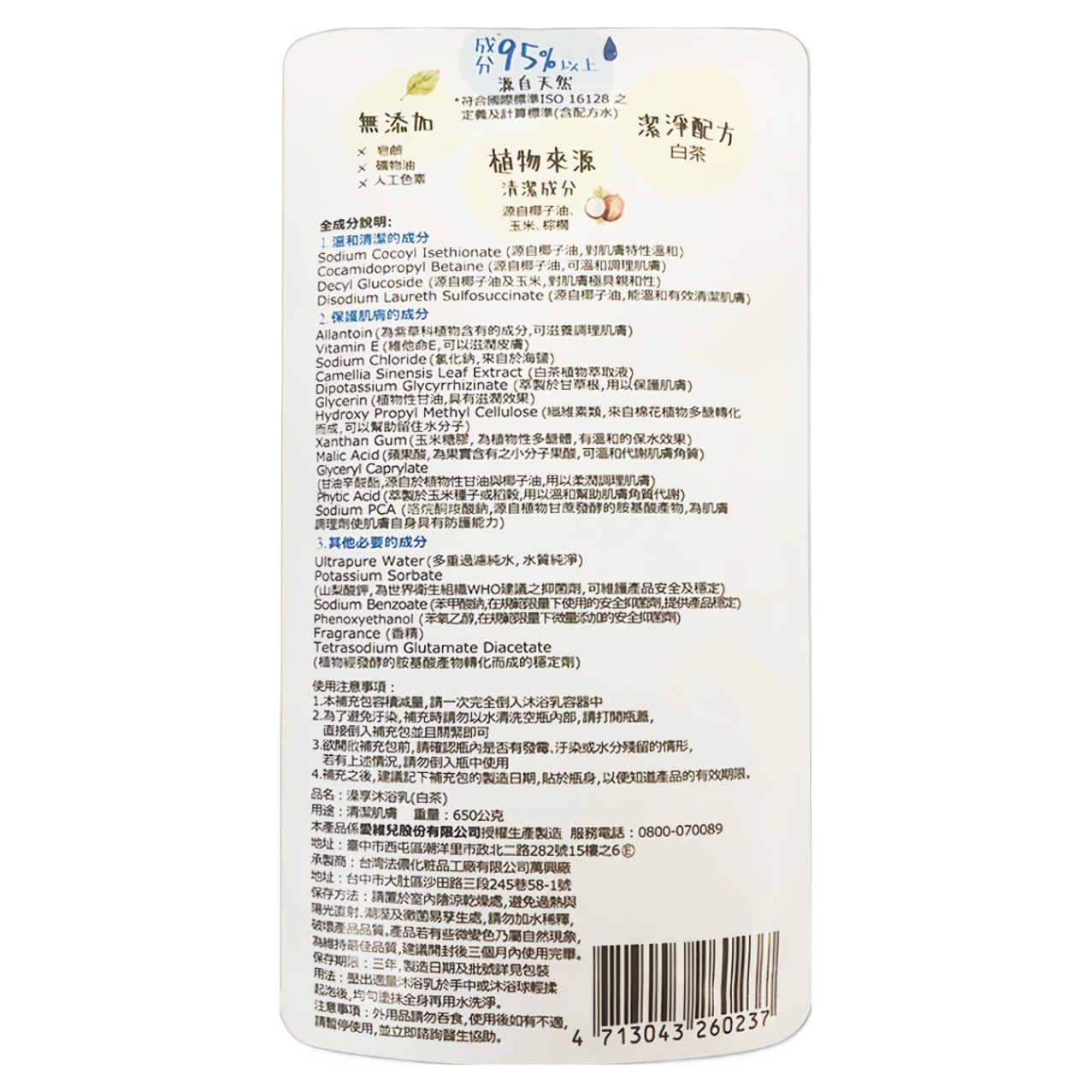 澡享白茶沐浴乳補充包,以簡約、安心、有效的潔淨配方,為您帶來清新舒暢的沐浴體驗。蘊含白茶精華,散發淡雅茶香,溫和潔淨肌膚,洗後不黏膩,讓您在沐浴時放鬆身心。成分單純,無皂鹼、礦物油、人工香料等添加物,男女通用,全家大小皆可安心使用,輕鬆補充,永續愛地球。讓每一次沐浴都成為享受,感受白茶帶來的清新與潔淨。