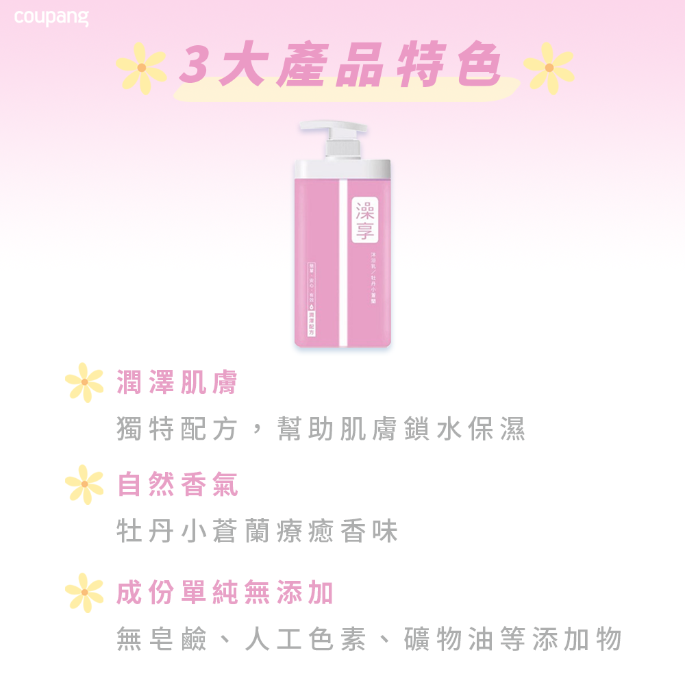 - 牡丹小蒼蘭沐浴乳,洗後散發迷人花香,讓您享受沐浴時光,心情愉悅放鬆。
