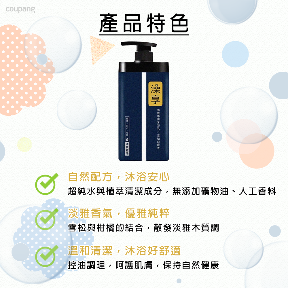 澡享男性專用沐浴乳,以雪松白麝香的沉穩香氣,為您帶來清新舒爽的沐浴體驗。專為男士肌膚設計,能有效清潔並調理肌膚油脂,洗後清爽不黏膩。1kg大容量,一瓶滿足您的長期需求。無添加礦物油及人工香料,溫和配方,讓您安心使用。每天使用,呵護您的肌膚,散發自信魅力。