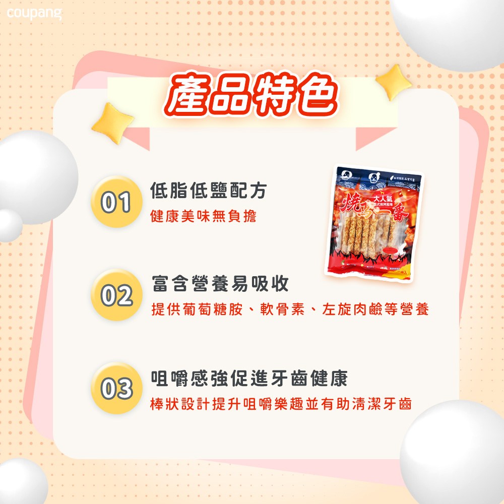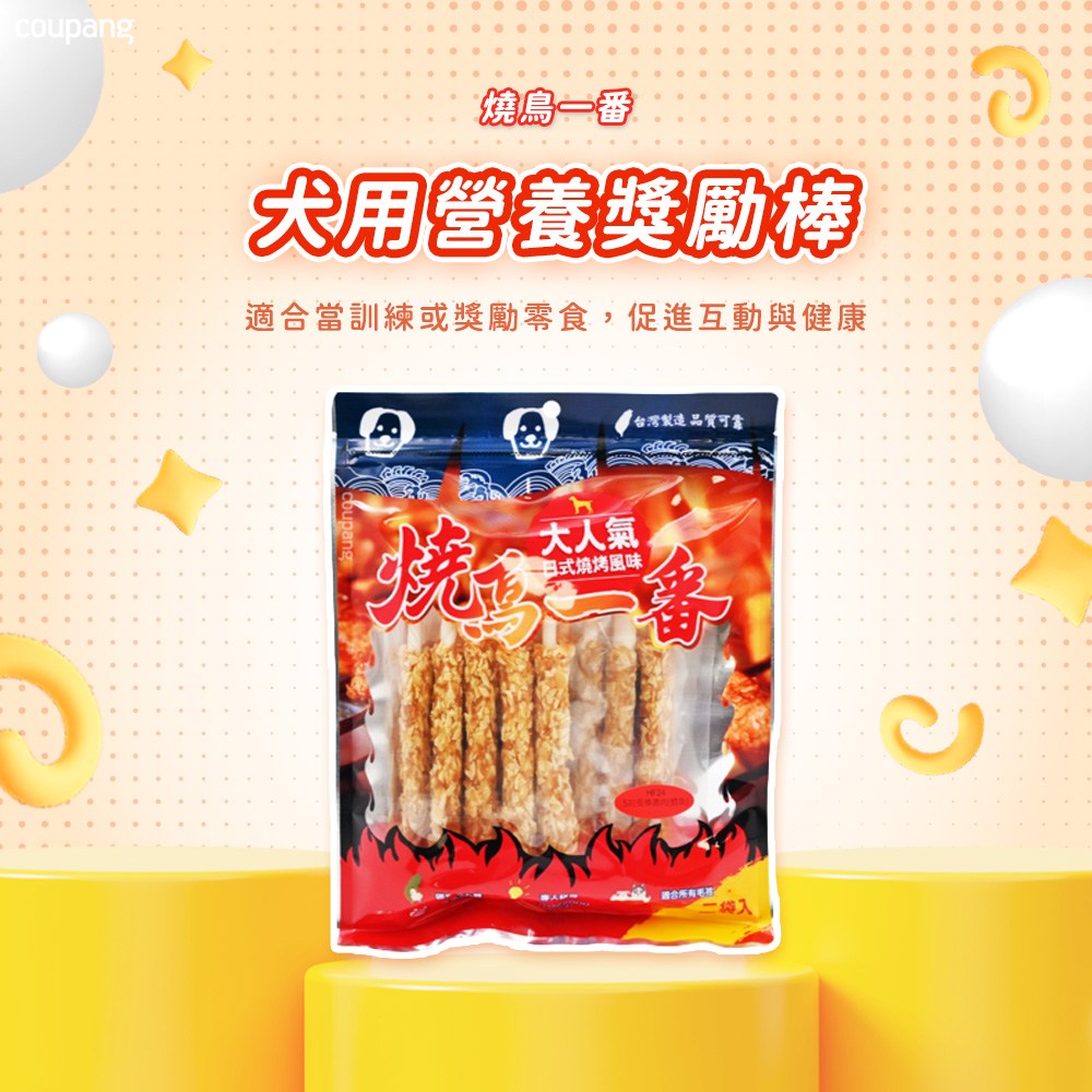 - 燒鳥一番長棒裹肉,口感豐富,讓狗狗享受咀嚼的樂趣,滿足牠們的咬合需求。