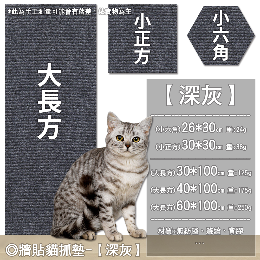 - 深灰色貓抓墊可黏貼於牆面,讓貓咪隨時享受磨爪樂趣,保護家具不受損。
